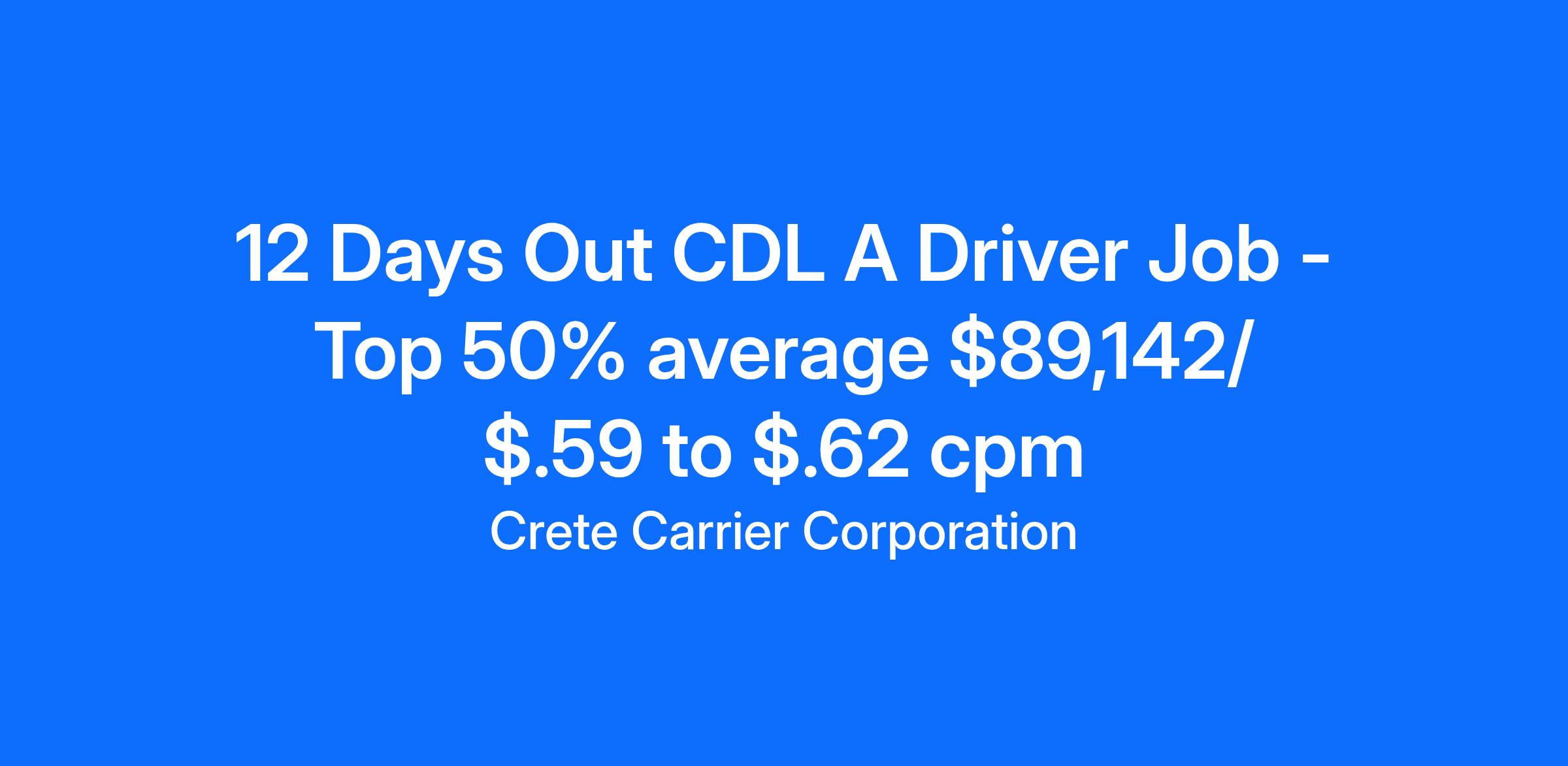Crete Carrier offers a 12 Days Out. 1 Day Home for Every 6 Days.Salary: Top 50% average $89,142 per yearCPM: Starting pay $.59 to $.62 cpmExperience: One-year verifiable tractor trailer experience with a class A CDL
