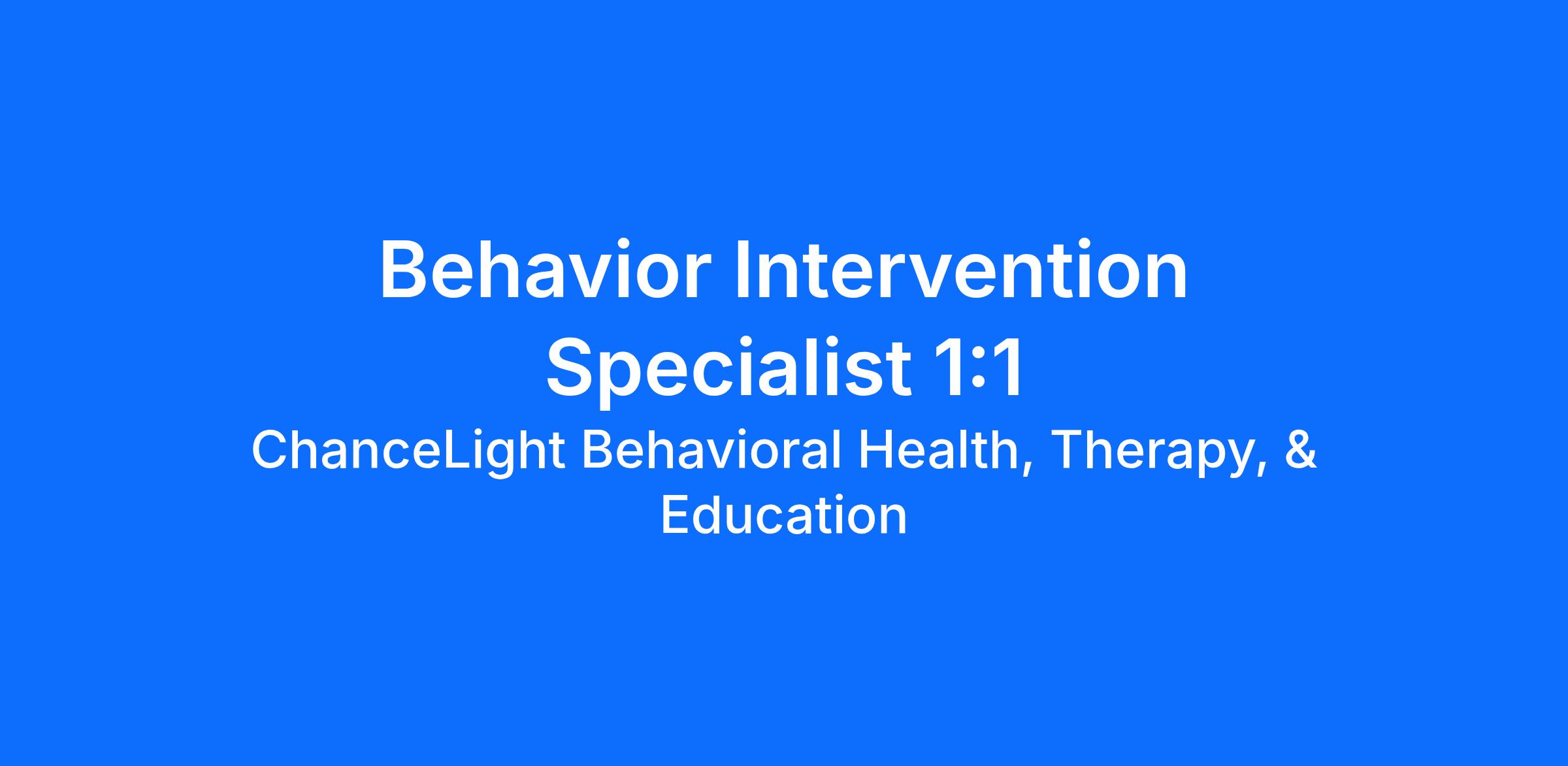 ChanceLight Behavioral Health, Therapy, & Education, a growing, dynamic organization with a social mission to offer hope, is seeking a Behavior Intervention Specialist 1:1 to join our award-winning Special Education team and perform meaningful work in a culture that welcomes innovation, encourages creative expression and offers limitless potential for personal and professional satisfaction!