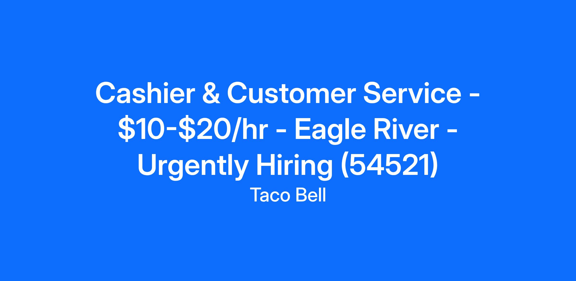 Taco Bell - Eagle River is looking for a full time or part time Cashier and Customer Service team member to join our location in Eagle River, WI. The Cashier and Customer Service position will be a blend of hospitality and operations. You will use cash registers, POS terminals, electronic scanners, and other related equipment to conduct monetary transactions with customers all while making sure our guests' needs are taken care of. At times you'll be responsible for making sure the front of the house is neat and orderly, restocking items, and answering the phone. The ideal candidate is dependable and reliable with excellent customer service skills, top-notch accuracy, and displays exceptional customer service to ensure the guests will return.