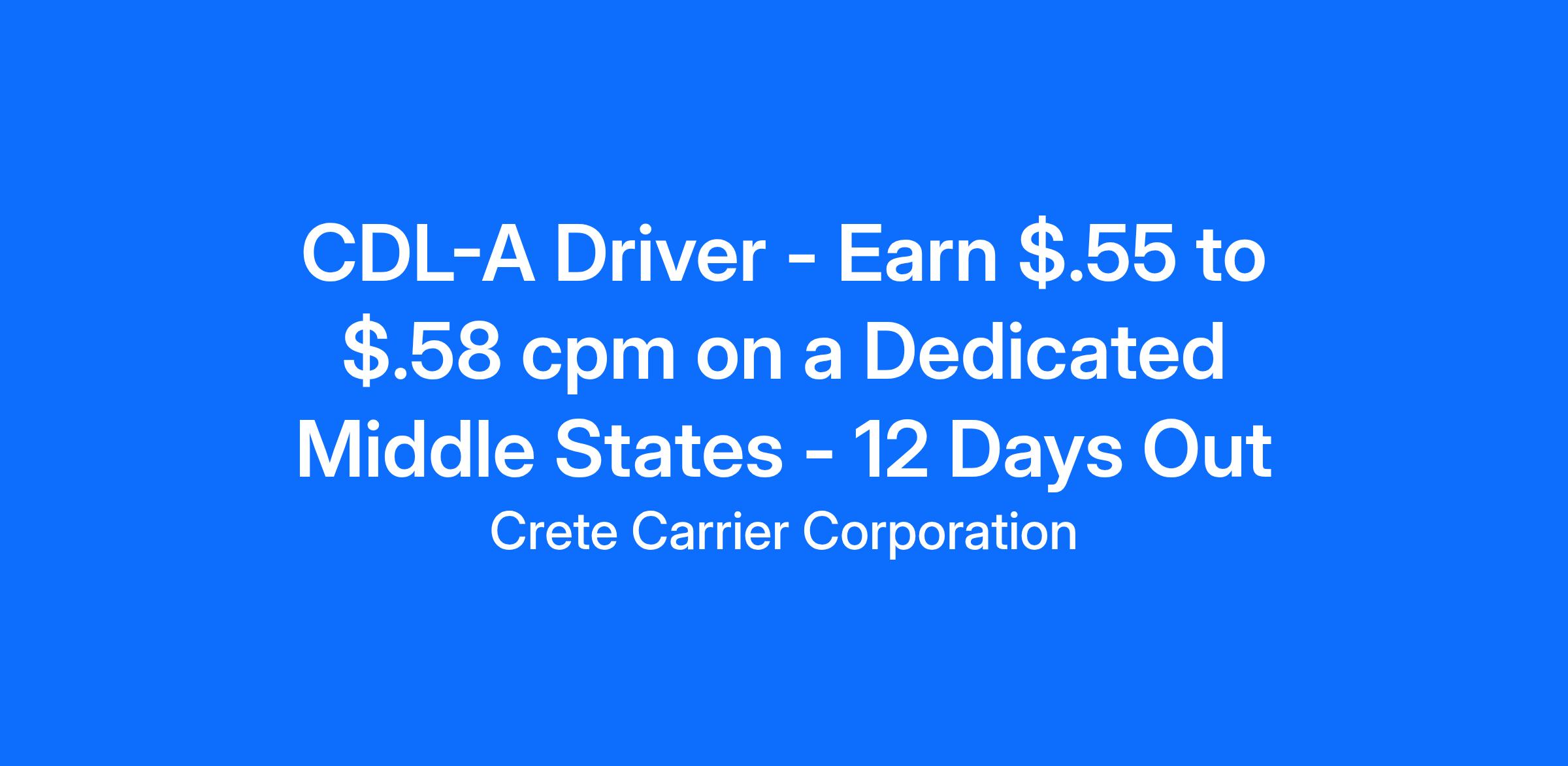 Crete Carrier offers CDL A Drivers a Dedicated Route -12 Days OutSalary: $79,000CPM: Starting pay $.55 to $.58 CPMExperience: One-year verifiable tractor trailer experience with a class A CDL