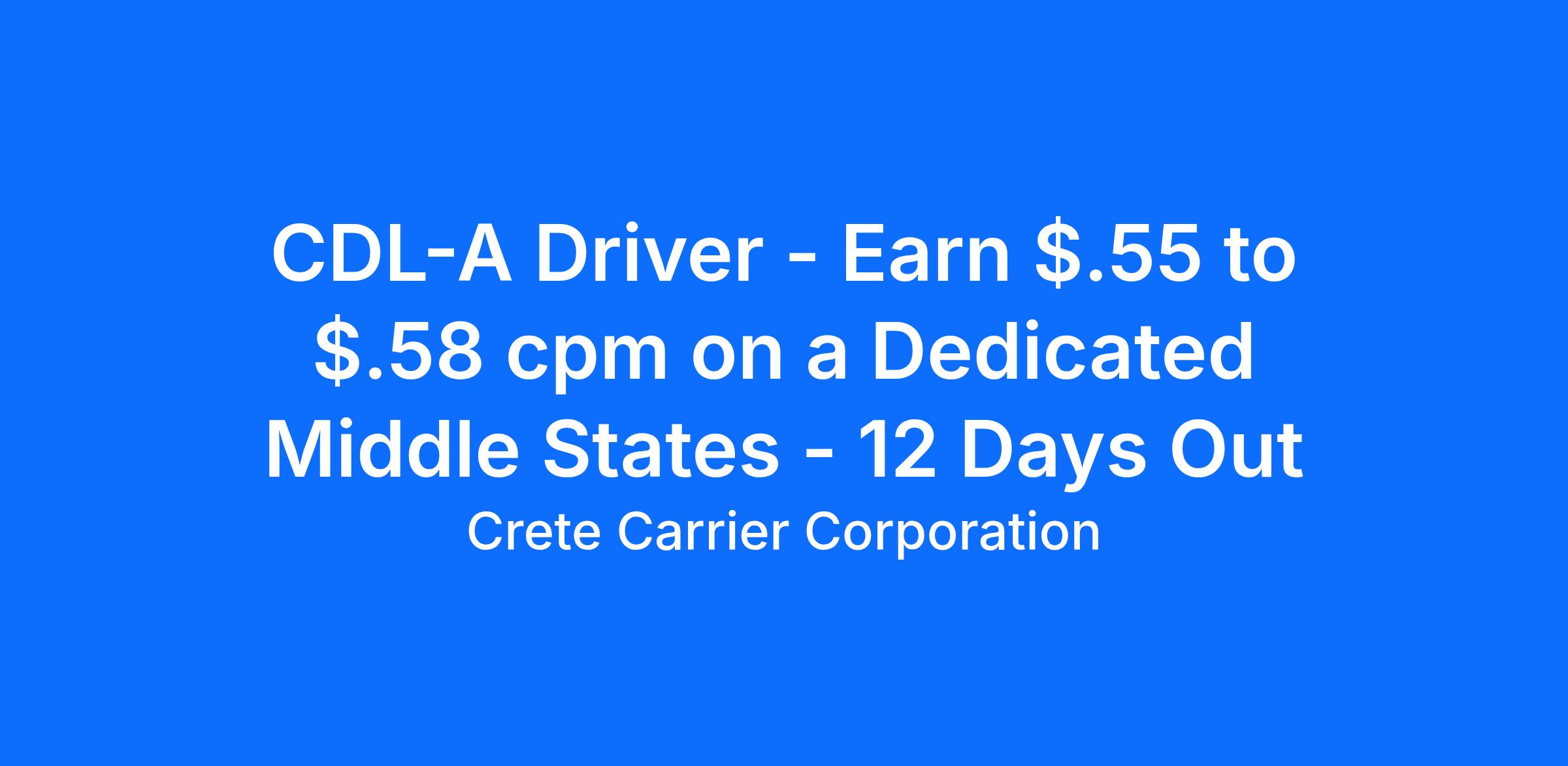 Crete Carrier offers CDL A Drivers a Dedicated Route -12 Days OutSalary: $79,000CPM: Starting pay $.55 to $.58 CPMExperience: One-year verifiable tractor trailer experience with a class A CDL
