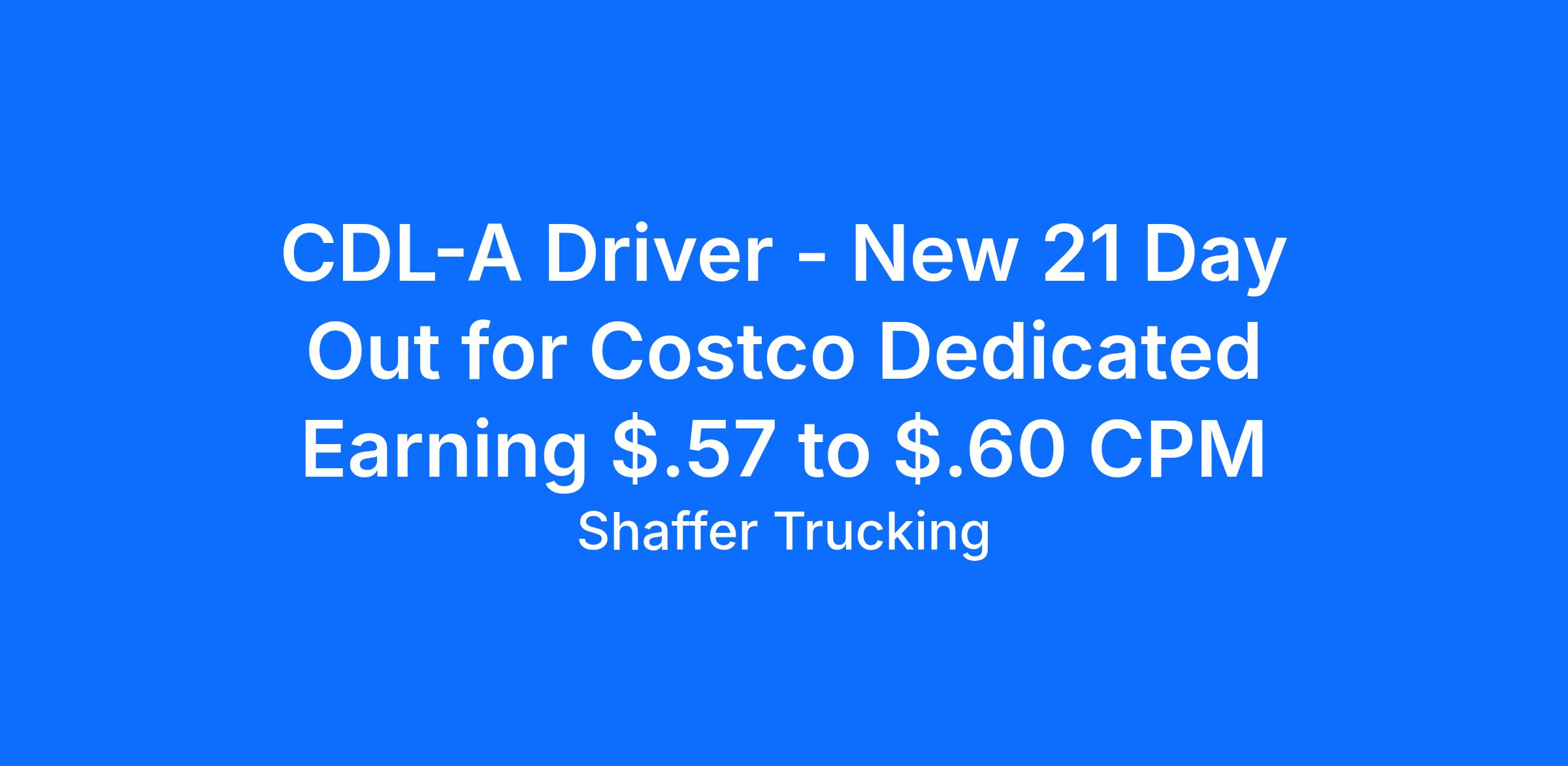 New Costco Dedicated 21 Days Out.Salary: Top 50% average $93,600 per yearCPM: Starting pay $.57 to $.60 cpmExperience: One-year verifiable tractor trailer experience with a class A CDL