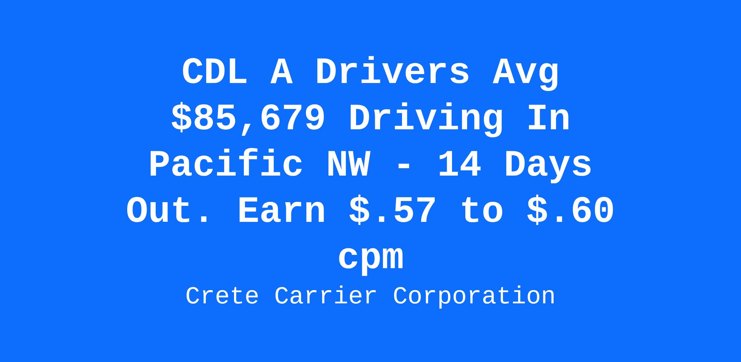 Crete Carrier offers a Regional Pacific NW for CDL A Drivers.Salary: $85,679CPM: Starting pay $.57 to $60 CPMExperience: One-year verifiable tractor trailer experience with a class A CDL
