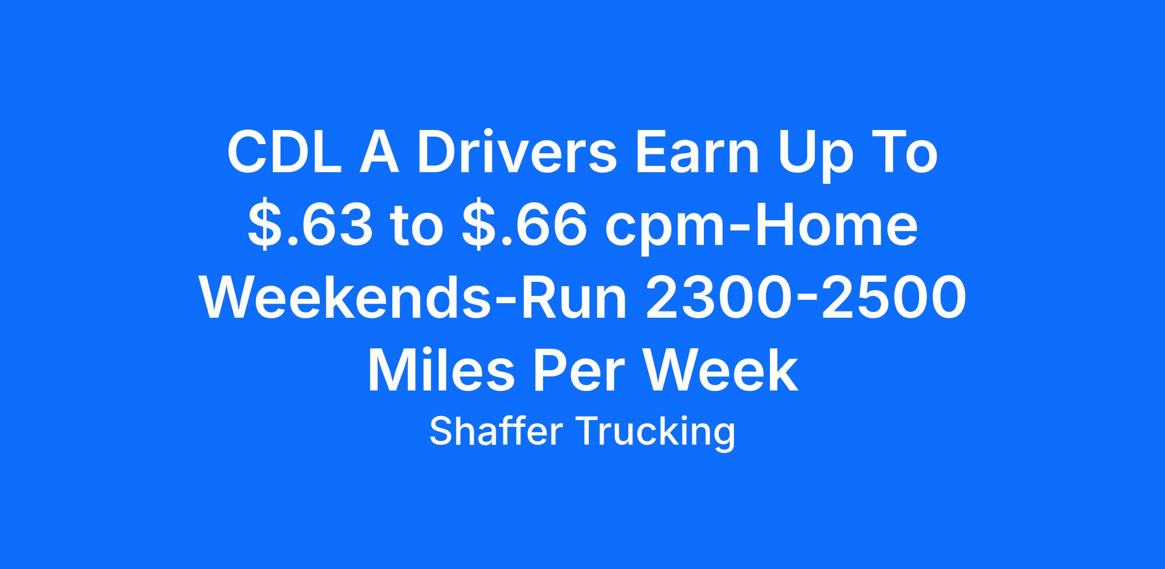 CDL A Drivers Earn Up To $.63 to $.66 cpm-Home Weekends-Run 2300-2500 Miles Per Week