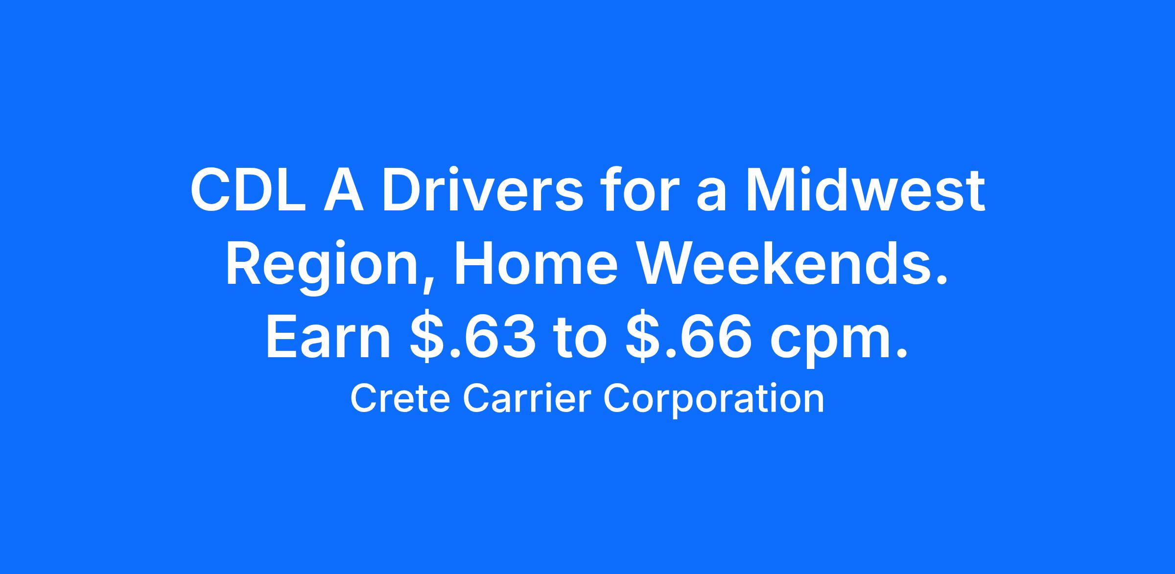 Crete Carrier offers home weekends with the Midwest Region fleet.Salary: Top 50% average $80,276 per yearCPM: Starting pay $.63 to $.66 cpmExperience: One-year verifiable tractor trailer experience with a class A CDL WHY CHOOSE CRETE CARRIER?At Crete Carrier and Shaffer Trucking, our miles are up significantly. In fact, we need more safe, experienced drivers to meet the needs of our customers. Crete, Shaffer, and Hunt drivers are paid based on practical miles. This means drivers are paid for 3-5 percent more total miles per year than companies that pay based on short route miles. Another added incentive is that those practical miles roll in faster now that we've recently raised our governed truck speed to 68 MPH on the cruise and 65 MPH on the pedal. The most productive 50 percent of our Crete Carrier and Shaffer Trucking OTR drivers average more than $96,542 annually. That equates to over $1,856 weekly; $.61 to $.64 CPM. The top 50% of our Hunt Transportation drivers average $93,347 annually ($1,795 per week), with starting pay ranging from $0.61 to $0.68 per mile. We also offer comprehensive and affordable health insurance, matching 401k and a profit-sharing plan that contributed $11 million in 2024 and more than $91.5 million to employee retirement accounts since 2018. AT CRETE, SHAFFER, AND HUNT, INDUSTRY LEADING PAY IS JUST THE BEGINNING WHAT IS LEADING PAY PLUS?Leading Pay Plus includes the industry leading pay that Crete Carrier Corporation is known for plus the extras which add more to a driver's bottom line, improve a driver's quality of life, and help a driver succeed in their profession. Take a few minutes to see how our Leading Pay Plus program stacks up against your current situation. We believe you'll choose Crete Carrier and Shaffer Trucking. About Crete CarrierOver the past 50 years, Crete Carrier has grown to one of the nation's largest, privately owned trucking companies. Along with sister company, Shaffer Trucking, and wholly-owned subsidiary Hunt Transportation, Crete Carrier Corporation operates as a truckload and flatbed carrier for virtually any commodity. Our drivers are among the best, exceeding the CSA score standards required by the U.S. Department of Transportation. Crete Carrier is a Leading Pay Plus Carrier with industry-leading benefits that include health insurance from BCBS of Nebraska, dental, vision, life, 401K, and a profit-sharing program. Because of this, drivers typically stay with us three times longer than the competition. *Some area restrictions apply.