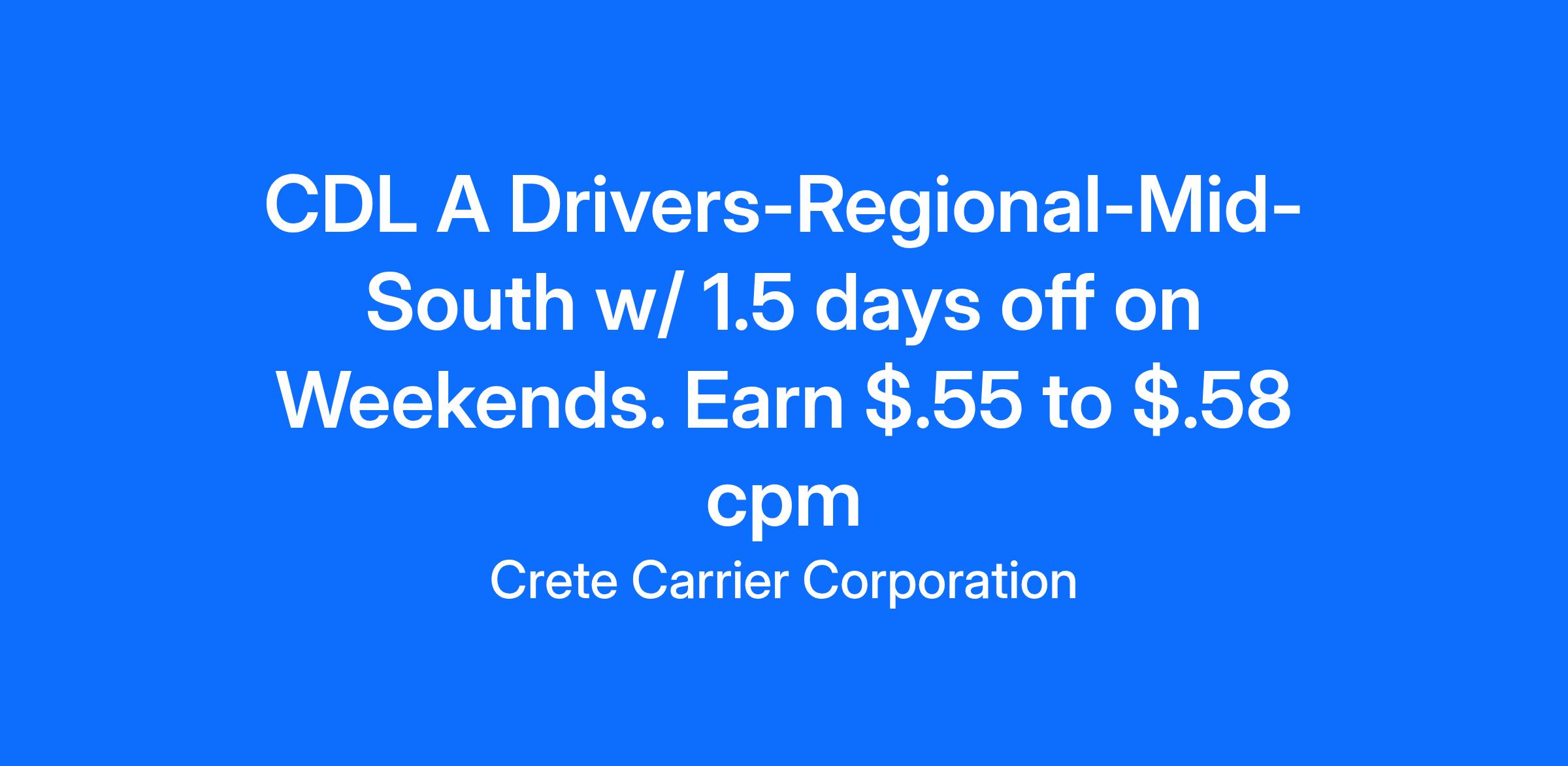 Crete Carrier offers CDL A Drivers a Mid-South Regional with Weekend Home timeSalary: $72,206CPM: Starting pay $.55 to $.58 CPMExperience: One-year verifiable tractor trailer experience with a class A CDL