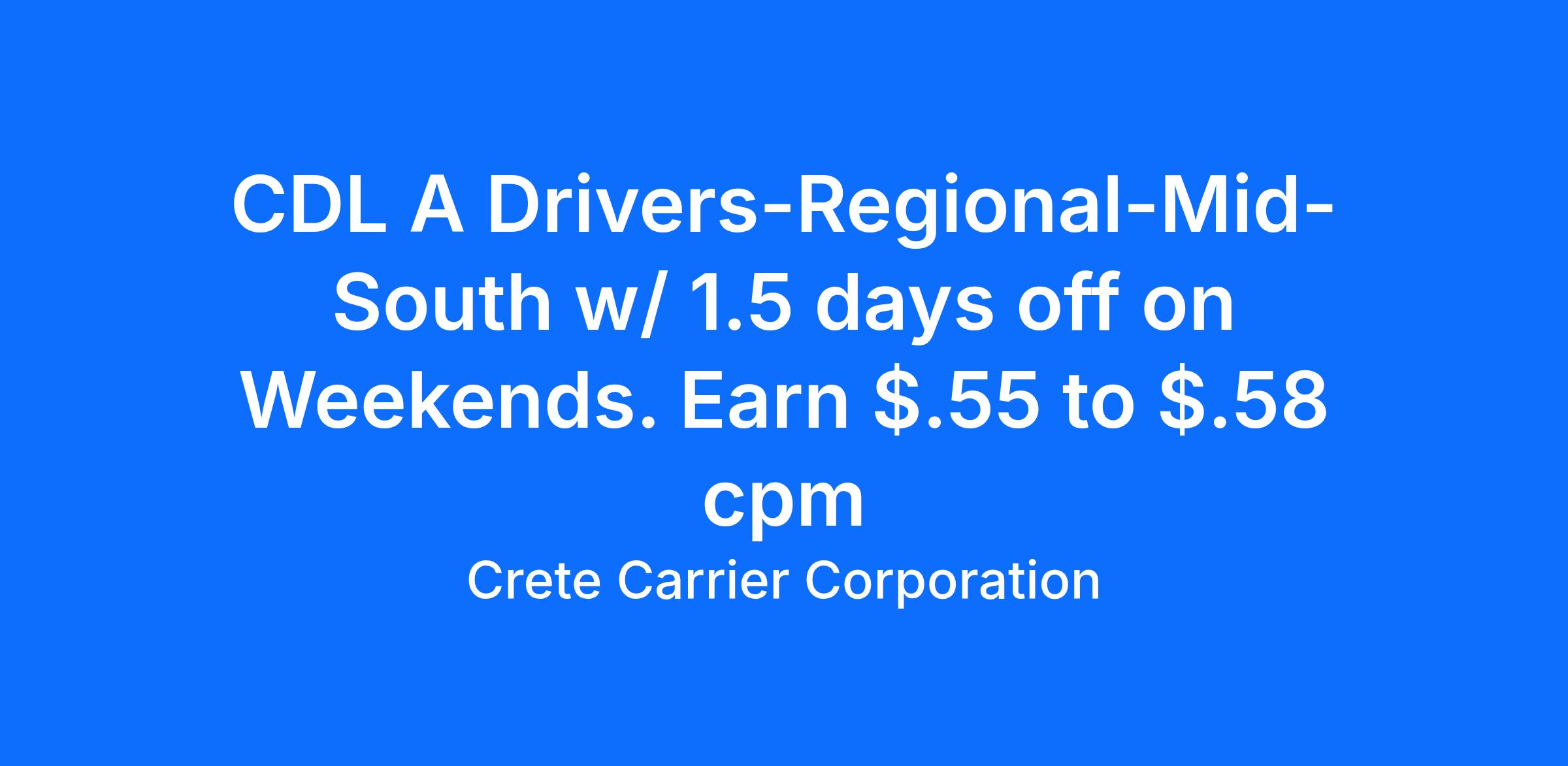 Crete Carrier offers CDL A Drivers a Mid-South Regional with Weekend Home timeSalary: $72,206CPM: Starting pay $.55 to $.58 CPMExperience: One-year verifiable tractor trailer experience with a class A CDL WHY CHOOSE CRETE CARRIER?At Crete Carrier and Shaffer Trucking, our miles are up significantly. In fact, we need more safe, experienced drivers to meet the needs of our customers. Crete, Shaffer, and Hunt drivers are paid based on practical miles. This means drivers are paid for 3-5 percent more total miles per year than companies that pay based on short route miles. Another added incentive is that those practical miles roll in faster now that we've recently raised our governed truck speed to 68 MPH on the cruise and 65 MPH on the pedal. The most productive 50 percent of our Crete Carrier and Shaffer Trucking OTR drivers average more than $96,542 annually. That equates to over $1,856 weekly; $.61 to $.64 CPM. The top 50% of our Hunt Transportation drivers average $93,347 annually ($1,795 per week), with starting pay ranging from $0.61 to $0.68 per mile. We also offer comprehensive and affordable health insurance, matching 401k and a profit-sharing plan that contributed $11 million in 2024 and more than $91.5 million to employee retirement accounts since 2018. AT CRETE, SHAFFER, AND HUNT, INDUSTRY LEADING PAY IS JUST THE BEGINNING WHAT IS LEADING PAY PLUS?Leading Pay Plus includes the industry leading pay that Crete Carrier Corporation is known for plus the extras which add more to a driver's bottom line, improve a driver's quality of life, and help a driver succeed in their profession. Take a few minutes to see how our Leading Pay Plus program stacks up against your current situation. We believe you'll choose Crete Carrier and Shaffer Trucking. About Crete CarrierOver the past 50 years, Crete Carrier has grown to one of the nation's largest, privately owned trucking companies. Along with sister company, Shaffer Trucking, and wholly-owned subsidiary Hunt Transportation, Crete Carrier Corporation operates as a truckload and flatbed carrier for virtually any commodity. Our drivers are among the best, exceeding the CSA score standards required by the U.S. Department of Transportation. Crete Carrier is a Leading Pay Plus Carrier with industry-leading benefits that include health insurance from BCBS of Nebraska, dental, vision, life, 401K, and a profit-sharing program. Because of this, drivers typically stay with us three times longer than the competition. *Some area restrictions apply.