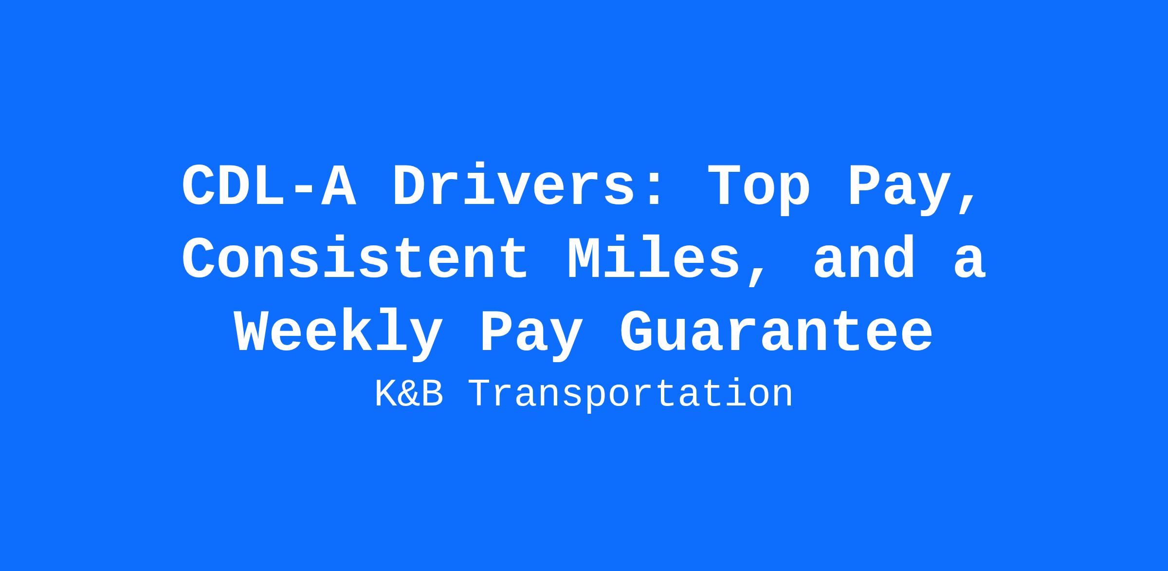 K&B Transportation GUARANTEES YOU $1426 per week minimum taking the worries out of your paycheck! Enjoy a 62 CPM starting wage with raises to 64 CPM! With our top miles and full accessory pay your guarantee is just a minimum! You can earn $1850 on top weeks with this leading pay package!