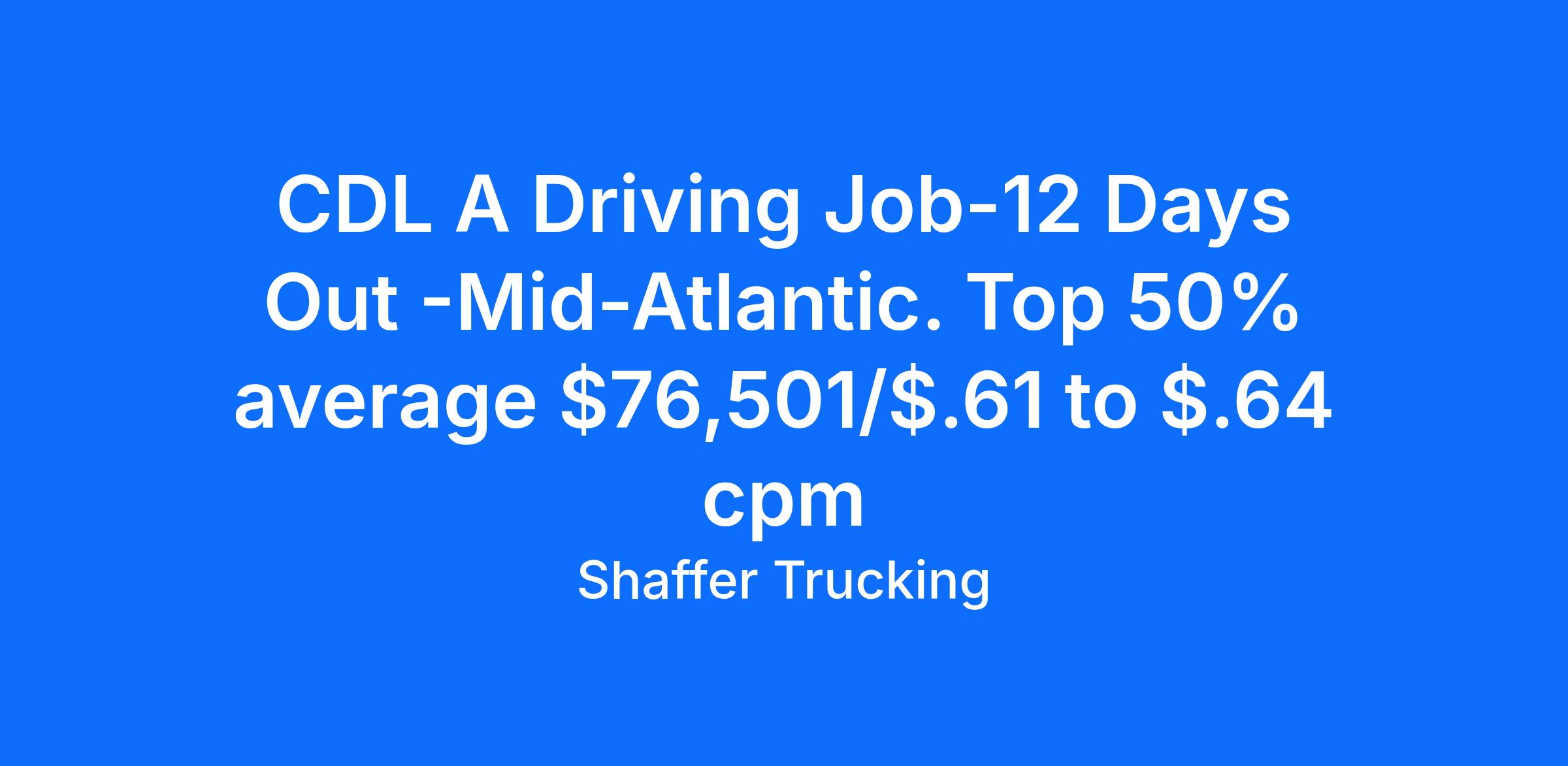 CDL A Driving Job-12 Days Out -Mid-Atlantic. Top 50% average $76,501/$.61 to $.64 cpm