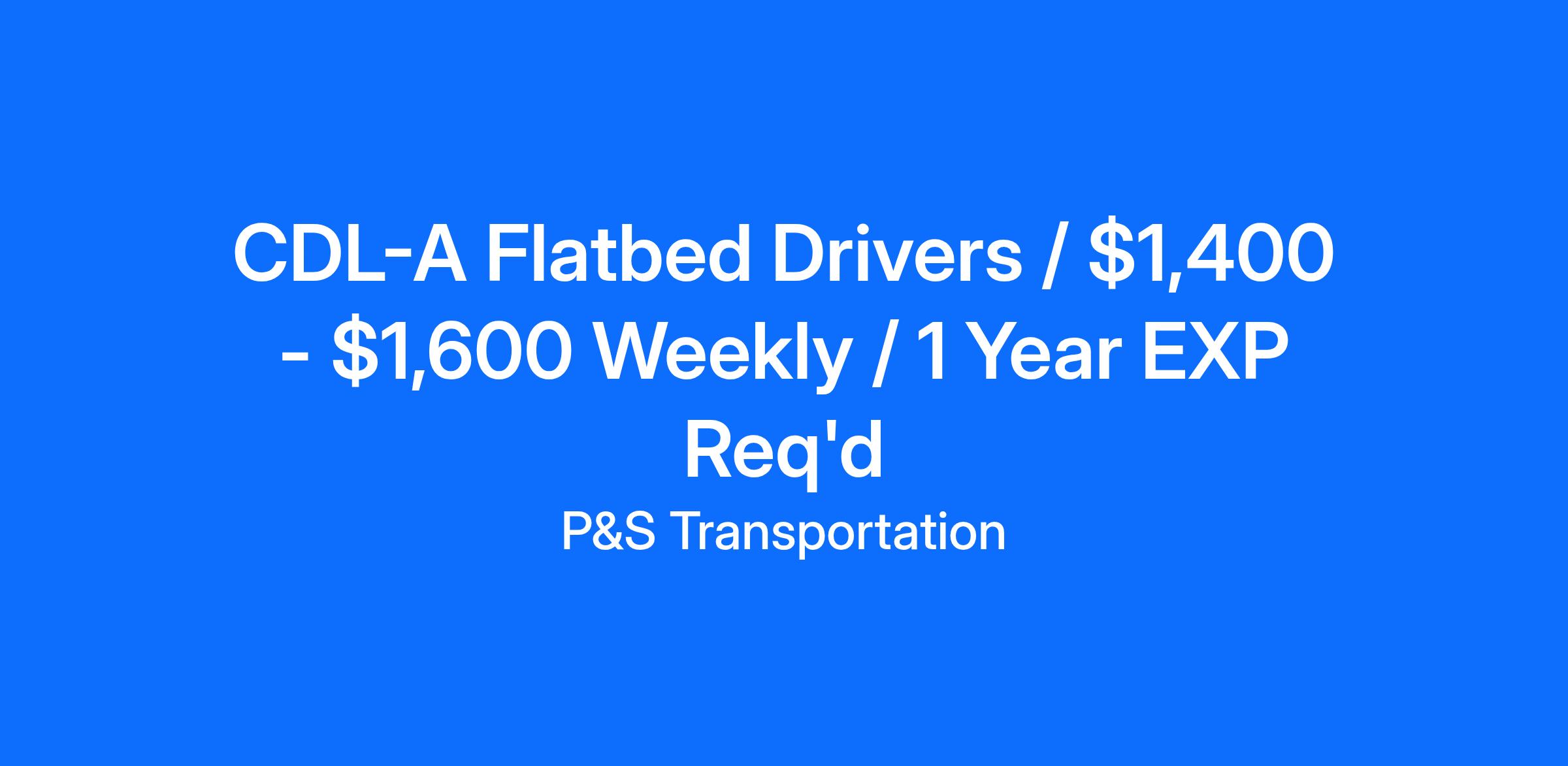 P&S Transportation is hiring CDL-A Flatbed Drivers!Family is important to us, so we get you home to yours Flatbed Driver Benefits:Earn 27% of load revenue - when freight goes up, your compensation does too!Top 25% of drivers earn $1,400 - $1,600 per week$5,000 Sign on Bonus$3,000 Referral BonusHome on weekendsPaid orientation with travel & meals included!Pet & Rider PolicyLease Purchase OptionNo forced dispatchFull medical and life insurance, 401k and more!Vacation payBest trucks & equipment Flatbed Driver Requirements:Valid CDL-AMust be 22 years oldMust have 1 year CDL-A OTR experienceMust have 6 months flatbed experienceNo DWI or DUI on MVR in the past 3 yearsNo more than one ""at-fault"" accident on MVR in past 3 years Why Drive Flatbed with P&S?Flatbed Drivers have grit and no one respects that more than all of us at P&S a true flatbed company. At P&S, you have the freedom to choose the type of loads, runs and home time that will allow you to succeed and have a life back home too. We don't just hire any flatbed driver. We look for people with the responsibility, experience and work ethic worthy of a partner. Being selective makes our team one of the most professional in the field. We share in revenue, support you to grow and go out of our way to make sure you have a great career as part of our family. We also offer best-in-class line haul pay. There's always an exceptional team supporting you with committed driver managers, great people in safety, benefits, management, and down the line. If a stable, long-term opportunity is what you're looking for, let's partner. Imagine 27% of Load RevenueYes, 27% of your load revenue is yours when freight rates go up, so does your compensation. That's one of the flatbed industry's highest compensation plans. Choose a lease purchase and your share increases to 70% of line haul. Our flatbed lease purchase program is one of our greatest features. We'll also get you home most weekends unless you have other needs to keep going. Our fleet is all-new model flatbed trucks supported by a professional maintenance network where safety is always a top priority. With P&S, you'll also receive comprehensive benefits like health plan options, 401k, financial incentives and much more. The Gold StandardWe have numerous award programs, like Drive for Gold, where you'll have access to reward points, safety videos and company leaderboards all available online. Keep track of your progress to earn great perks like a new TV or even a cruise. You can also get real-time access to settlements, safety information and dispatch status through our Driver Web and mobile app. We also offer free, confidential chaplain services as an extension of our open door policy. We're setting a higher standard in trucking.