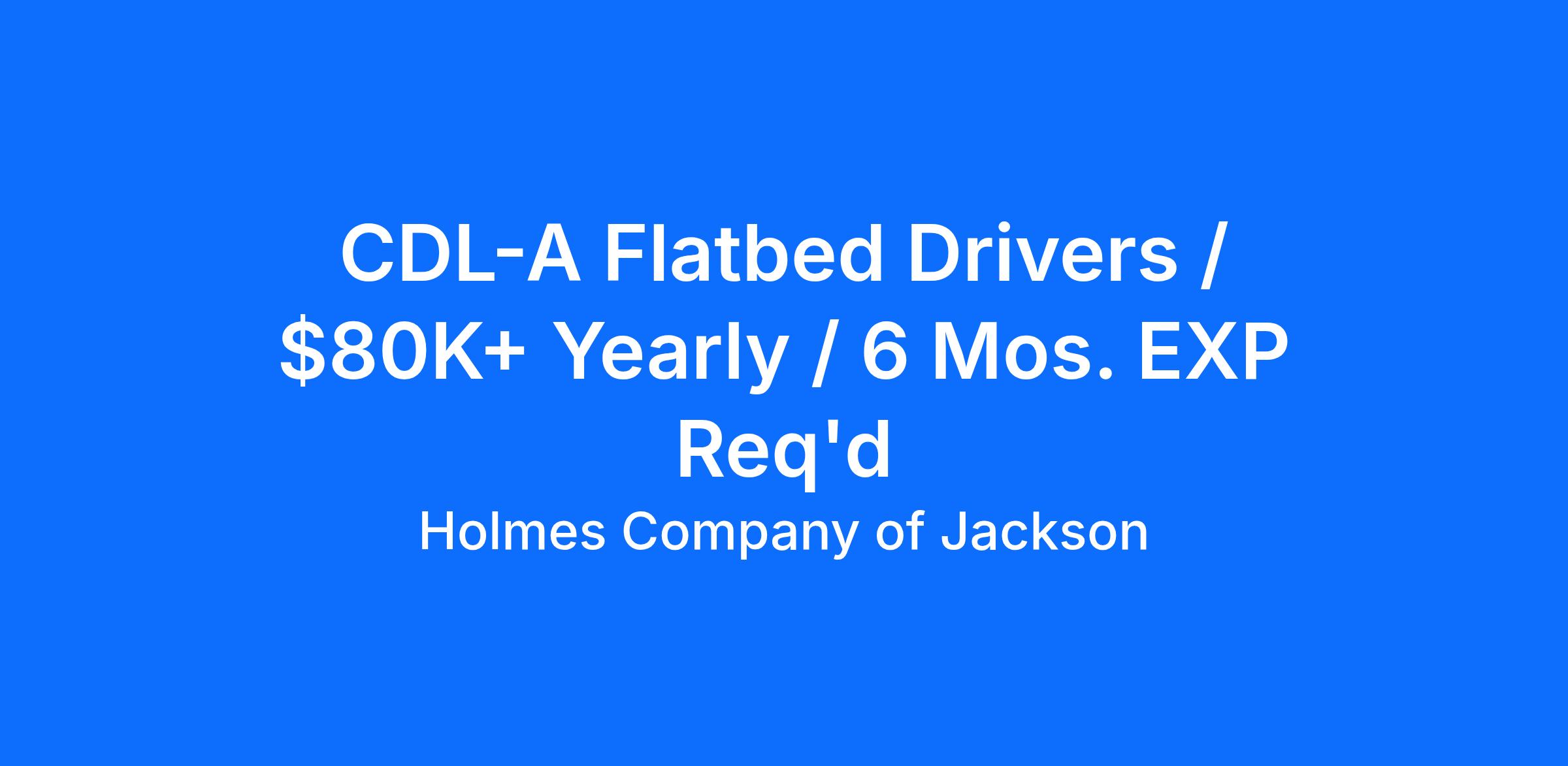 HIRING SPECIALIZED AND FLATBED COMPANY DRIVERSTop Drivers Can Earn $80K+ a Yearand Get Home Weekly!Benefits:Average weekly pay range of $1,200 - $1,700Weekly home timeBonus checks twice a year!Orientation pay with hotel and transportation accommodationsEFS fuel cardPre-Pass/Best Pass deviceReferral bonus programVacation payFREE-to-you passenger programGroup insurance includes: medical, dental, vision, and life insurance (family plans available)Retirement plans: 401k, RothCompany matched dollar for dollar up to 3%, and then 0.50 per dollar up to 6%Requirements:At least 6 months of driving experienceValid Class A CDLAbility to pass a drug testClean MVR for the last 3 yearsAbility to pass DOT physical About Holmes Company of Jackson Inc:Holmes Company started in 1981 with one truck. Today the fleet consists of 100 power units operating throughout the 48 states, meeting the needs of the customers. We offer long-haul, regional, and Logistics Services to our customers, allowing us the opportunity to meet any need they may have. To accomplish this, we hire only the “BEST” experienced and qualified drivers in the marketplace. We have one of the lowest turnover rates in the industry. Along with the trucking experience in our organization, we contribute our success to hard work and dedication to our people and our customers. Our people are our greatest asset. —The Holmes Company IS OUR PEOPLE.