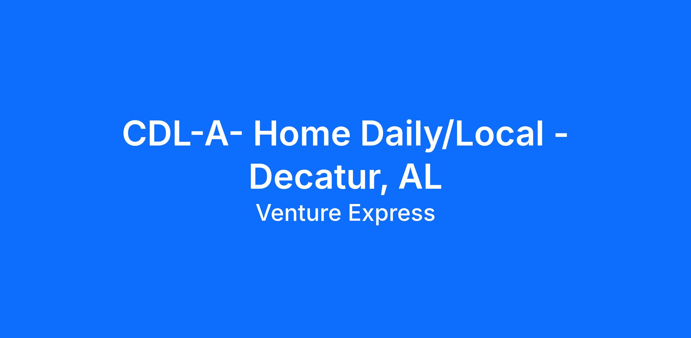 Local/Home Daily - Domicile: Decatur, ALTerminal: Decatur, ALLong Description: Daily movements within a 300 mile radius.Short Pay Description: 1st Shift - Starting at $21.00 per hour with a $0.50 increase every 6 months to $23.00 per hour.Home Time: Home DailyPay DetailsStarting at $21.00 per hour with a $0.50 increase every 6 months to $23.00 per hourHoliday Pay is $160 per day, eligible after 60 days of employment.$0.01 per mile Safety Bonus eligible, paid monthly. Safety Bonus is subject to successfully completing all Safety Bonus eligibility requirements.Anniversary bonus of $1,200 paid after each year of service6th day may be required when requested by our customerThis position is exempt from overtime pay pursuant to Section 13(b)(1) of the Fair Labor Standards Act (FLSA)Operational DetailsDedicated customers with consistent routes supporting the automotive industryDrop and hook no touch freightSlip Seat PositionMultiple start times are available to fit your scheduleAdvanced technology for electronic logs and dispatchInward/Outward facing camerasNo Rider and No Pet PolicyBenefits:Weekly direct deposit3 Blue Cross/Blue Shield of TN medical options to choose from starting as low as $30.00 per week for single coverage & $85.00 per week for familyIndividual and family medical plans available with multiple tiersHSA and FSA account optionsDental and vision plans with DeltaCompany paid life insurance of $25,000Two-day in class paid orientation, lunch provided. Third-day Ride-A-Long at home Terminal401K retirement planWork Life Matters Employee Assistance ProgramVoluntary enrollment options for disability, accident and critical care insurance policies availableCoverage for benefit plans are effective on the first of the month following 60 days of employment Qualifications:Must have a valid Class A CDL Interstate drivers license.Must pass a DOT physical from one of our chosen FMCSA qualified clinics.Must pass a pre-employment drug screen.Must be able to operate a CMV on public roadways.Must be 23 years or older.No Felony convictions, pled "guilty" to or "No Contest" to crimes involving violence, dishonesty or drugs in the past 10 years.No failed DOT drug or alcohol tests. No Refusals. No Applicants from SAP Program.No DUI convictions, open container, or alcohol related incidents in previous 7 years.No Careless driving or reckless driving convictions on MVR or PSP in the previous 3 years.No at fault rear end collisions, rollover accidents, or jackknife accidents in the previous 3 years.12 months experience in the past 3 years pulling a 53 ft van if for van fleet of which 12 months.No more than a combination of 3 qualifications below: No more than 2 at fault accidents in the previous 3 years and No more than 2 moving violations in the previous 3 years.An acceptable PSP report; Combination of 4 or more violations, inspections, or warnings MUST be reviewed and approved by safety.No speeding convictions of 15 mph or more over the posted speed limit in the previous 3 years.Required to have 10 years of experience filled out; If there is a gap of 6 months or more of employment, then we must have a signed Employment of Declaration document.Verify 3 years of Class A CDL driving experience.Three or more jobs in the last 12 months goes to auditNo convictions for using a handheld device while driving subject to state and/or federal lawMust be able to pass a road test administered by Venture ExpressMust meet all qualifications in section 391.11 of the FMCSA regulations handbookPrimary residence must be within: (Home Daily/Local) a 50-mile commute from the Domicile assigned on hire date. (OTR/Regional) a 100-mile commute from the Domicile assigned on hire date. About Venture Express, Inc.Venture Express, Inc. wants a team of world-class Company Drivers like you, and that's exactly the way you deserve to be treated. Whether you live for the open highways or the city streets, adventuring for days, or coming home every night, Venture Express, Inc. has a career opportunity as a company truck driver suited perfectly for you. You will be recognized and rewarded for your accomplishments as a professional company truck driver while operating top-notch equipment. Are you ready to start your driving career with Venture Express Inc.? We invite you to FUEL your Class A CDL career with Venture Express, Inc. today. Venture Express, Inc. is an equal employment opportunity employer. As such, Venture Express, Inc. offers equal employment opportunities without regard to race, color, religion, sex (including pregnancy), national origin, age, disability, genetic information, veteran status, or any other status protected by law. These opportunities include all terms, conditions and privileges of employment, including but not limited to recruitment, selection, hiring, job placement, training, compensation, discipline, discharge, advancement and termination. Venture Express, Inc. does not give hiring preference to applicants based on the previously listed characteristics.