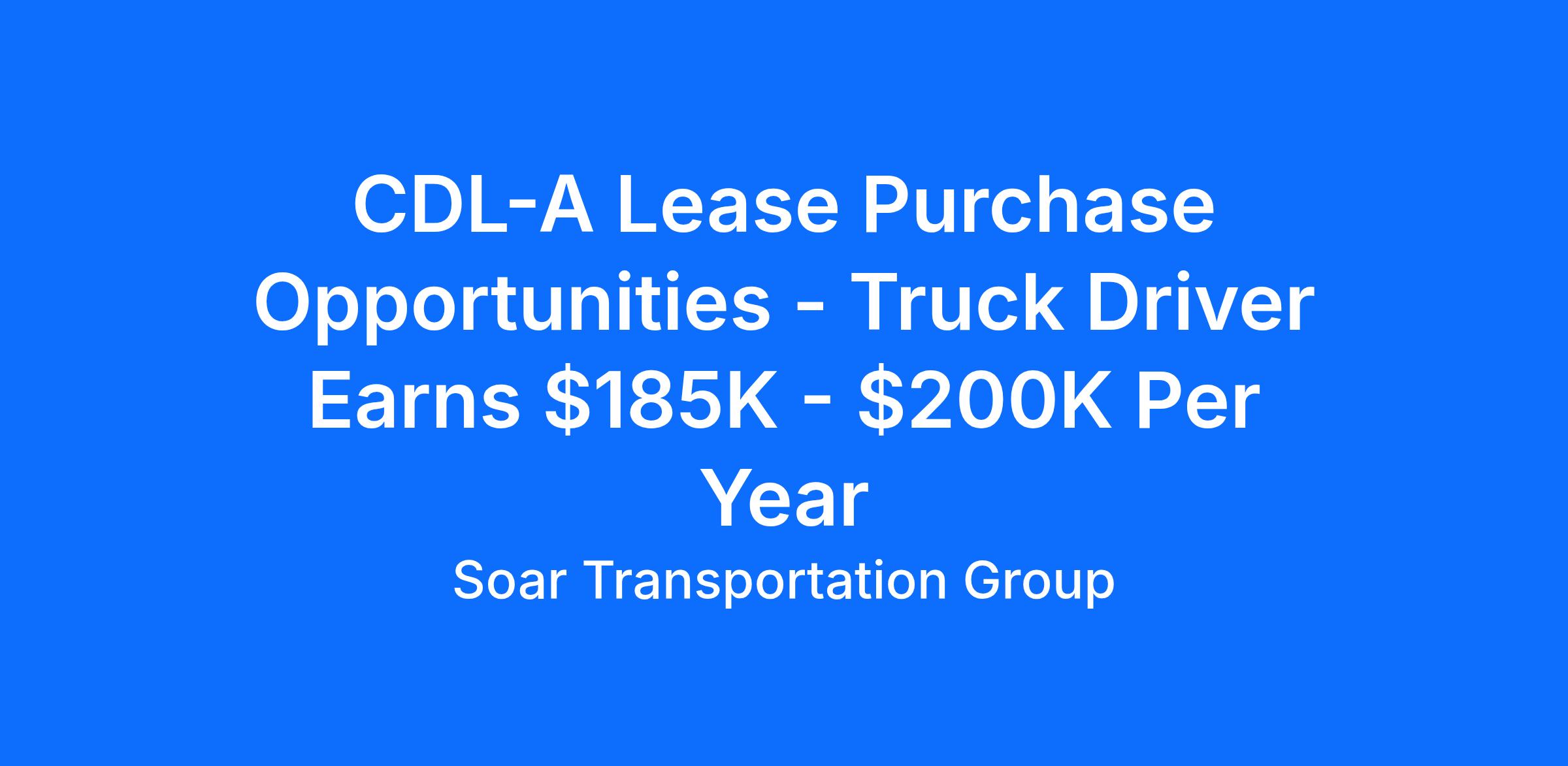Take Flight In Your New TruckYou'll fly high indeed with an average $200,000-$215,000 per year, a pay increase that puts the driving business of your dreams closer than ever. In addition to outstanding pay, our lease-purchase program also offers the support every new truck owner needs to succeed. Seize the dream of driving independence and take flight in your new truck today with SOAR. CDL-A Lease Purchase Experienced Truck Drivers
