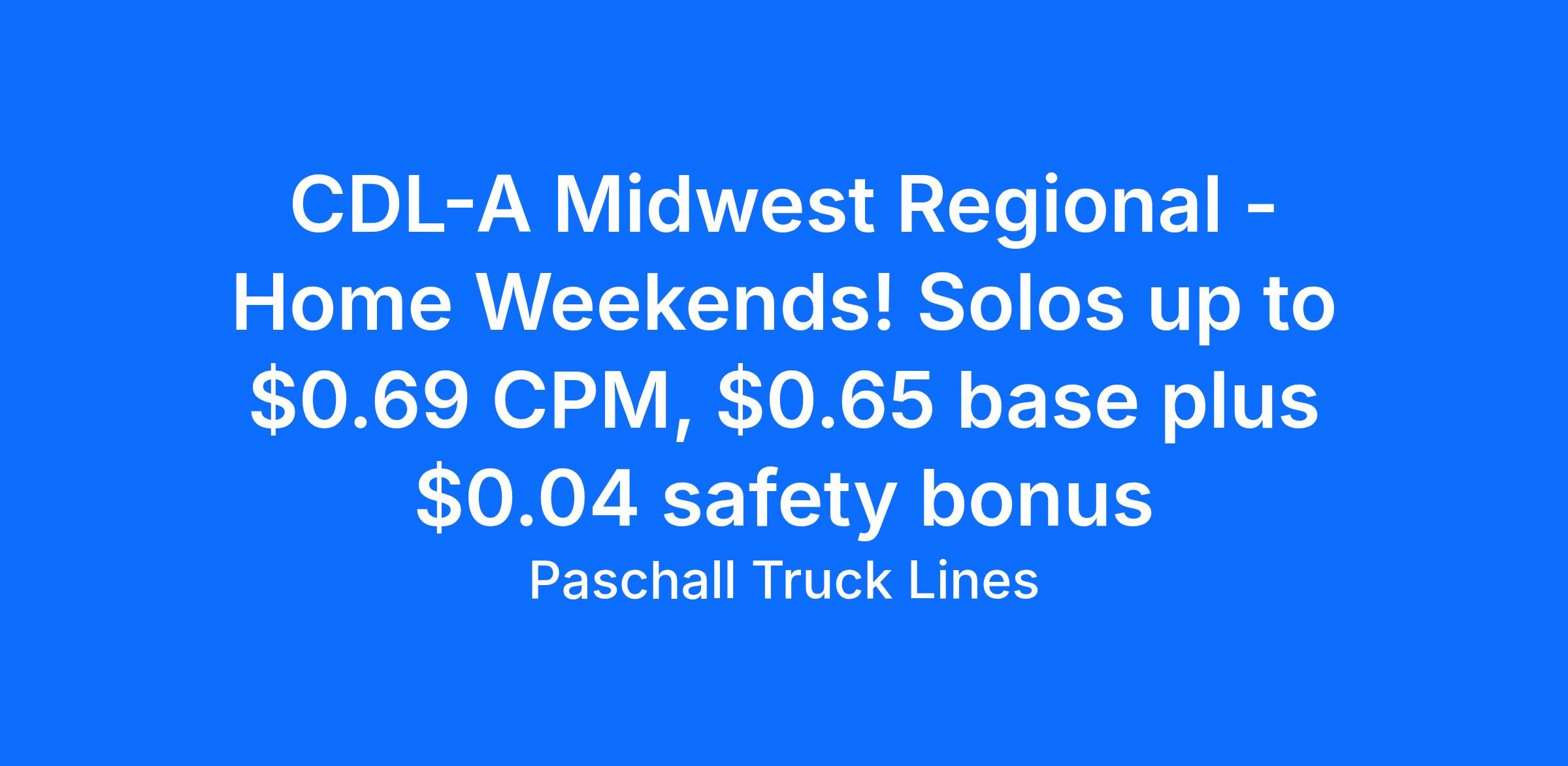CDL-A Midwest Regional - Home Weekends! Solos start up to $0.69 CPM, $0.65 base + $0.04 CPM