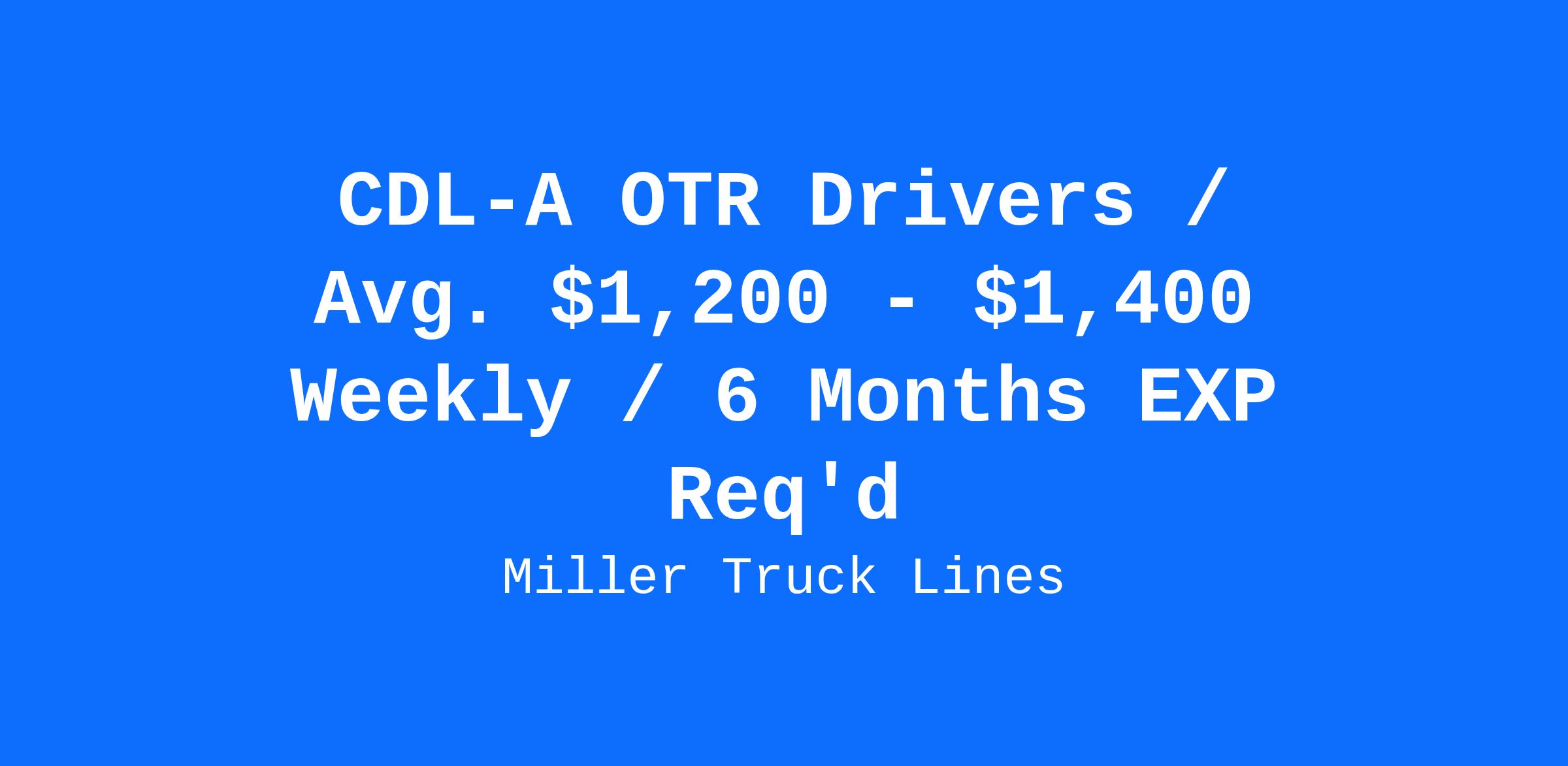 Miller Truck Lines is Hiring CDL A OTR Drivers for our Flatbed and Reefer Divisions Drivers earn an average of $1,200 - $1,400 per weekDrop and HookFlexible Home TimePre-planned Loads Benefits:OTR positions now available with Flexible Home TimeBrand New 2023 trucks now available!Ask about our sign-on bonusPet and rider policy$1,000 - Referral Bonus100% Fuel surcharge$500.00 orientation pay ? travel and hotel provided (breakfast and lunch provided)Tarp and stop payPaid vacationMedical, dental, and vision insurance401K with company match Additional Benefits:Flatbed and Reefer opportunities availableBase plates and permits providedVariety of routing optionsGreat career paths Requirements:At least 22 years of age or olderValid Class A CDLAt least 6 months of tractor trailer experienceNo more than 3 moving violations in the past 3 yearsTruck must be 2005 or newer to pull FLATBED trailersTruck must be 2015 or newer to pull REFRIGERATED trailers About Us:Miller Truck Lines is a diverse company which gives drivers the opportunity to learn the different faces of transportation under one roof! We have shuttle, local, regional, and over-the road (OTR) opportunities available which gives our drivers the flexibility of being home daily, weekly, bi-weekly or monthly. At Miller, our drivers are treated as family, and we continually work to cultivate communication and match driver personalities with a fitting counterpart in a driver manager. Miller Truck Lines has an appreciation for the individuals and the sacrifices that our drivers, as well as non-drivers, make to achieve success.Founded in 1983, Miller Truck Lines, LLC works hard not only to satisfy customer needs but also to provide opportunities for employees and contractors to work for a family-owned, family-lead company. Strong work ethic, diversity in services and most importantly...people make Miller successful!Miller Truck Lines, headquartered in Tulsa, Oklahoma, was founded and incorporated in 1983. Miller is a family-owned and operated company with deep-rooted family values. Our founders, James and Bonnie Miller knew firsthand the challenges and rewards of sitting behind the wheel. Miller has an appreciation for the individuals and the sacrifices that our drivers, as well as non-drivers, make to achieve success.Miller Truck Lines is an equal employment opportunity employer. As such, Miller Truck Lines offers equal employment opportunities without regard to race, color, religion, sex (including pregnancy), national origin, age, disability, genetic information, veteran status, or any other status protected by law. These opportunities include all terms, conditions and privileges of employment, including but not limited to recruitment, selection, hiring, job placement, training, compensation, discipline, discharge, advancement and termination. Miller Truck Lines does not give hiring preference to applicants based on the previously listed characteristics.
