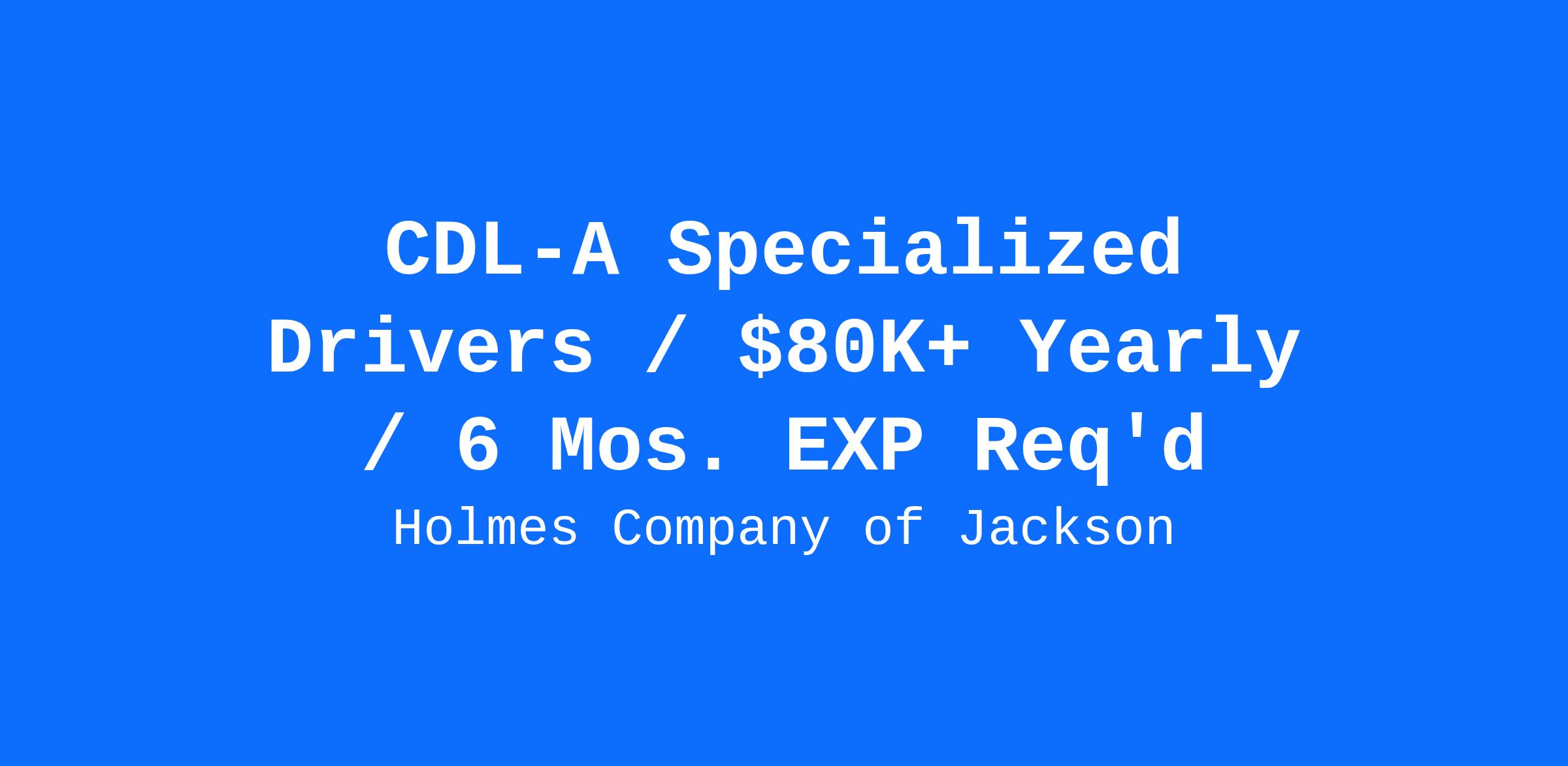 HIRING SPECIALIZED AND FLATBED COMPANY DRIVERSTop Drivers Can Earn $80K+ a Yearand Get Home Weekly!Benefits:Average weekly pay range of $1,200 - $1,700Weekly home timeBonus checks twice a year!Orientation pay with hotel and transportation accommodationsEFS fuel cardPre-Pass/Best Pass deviceReferral bonus programVacation payFREE-to-you passenger programGroup insurance includes: medical, dental, vision, and life insurance (family plans available)Retirement plans: 401k, RothCompany matched dollar for dollar up to 3%, and then 0.50 per dollar up to 6%Requirements:At least 6 months of driving experienceValid Class A CDLAbility to pass a drug testClean MVR for the last 3 yearsAbility to pass DOT physical About Holmes Company of Jackson Inc:Holmes Company started in 1981 with one truck. Today the fleet consists of 100 power units operating throughout the 48 states, meeting the needs of the customers. We offer long-haul, regional, and Logistics Services to our customers, allowing us the opportunity to meet any need they may have. To accomplish this, we hire only the “BEST” experienced and qualified drivers in the marketplace. We have one of the lowest turnover rates in the industry. Along with the trucking experience in our organization, we contribute our success to hard work and dedication to our people and our customers. Our people are our greatest asset. —The Holmes Company IS OUR PEOPLE.