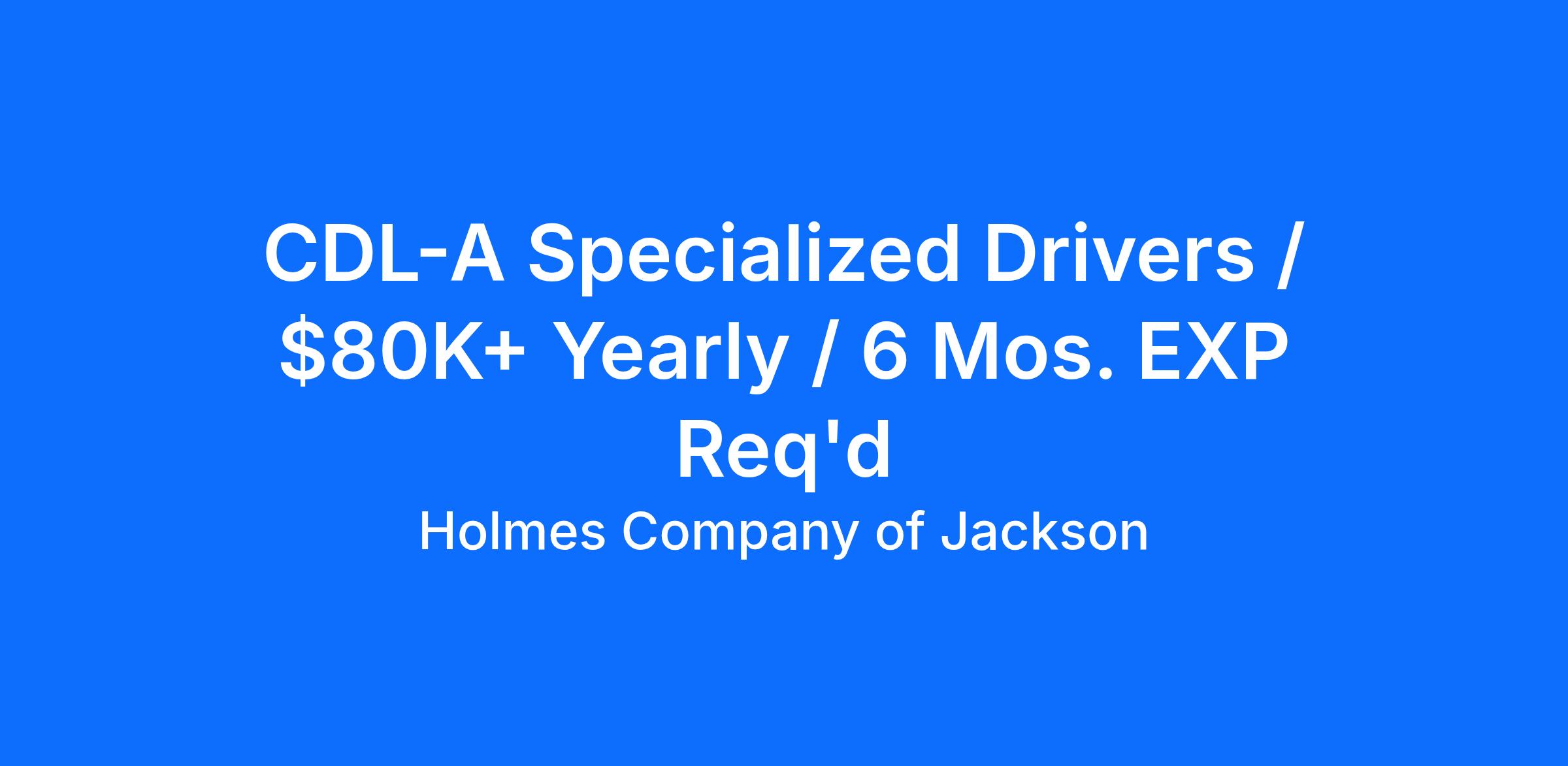 HIRING SPECIALIZED AND FLATBED COMPANY DRIVERSTop Drivers Can Earn $80K+ a Yearand Get Home Weekly!Benefits:Average weekly pay range of $1,200 - $1,700Weekly home timeBonus checks twice a year!Orientation pay with hotel and transportation accommodationsEFS fuel cardPre-Pass/Best Pass deviceReferral bonus programVacation payFREE-to-you passenger programGroup insurance includes: medical, dental, vision, and life insurance (family plans available)Retirement plans: 401k, RothCompany matched dollar for dollar up to 3%, and then 0.50 per dollar up to 6%Requirements:At least 6 months of driving experienceValid Class A CDLAbility to pass a drug testClean MVR for the last 3 yearsAbility to pass DOT physical About Holmes Company of Jackson Inc:Holmes Company started in 1981 with one truck. Today the fleet consists of 100 power units operating throughout the 48 states, meeting the needs of the customers. We offer long-haul, regional, and Logistics Services to our customers, allowing us the opportunity to meet any need they may have. To accomplish this, we hire only the “BEST” experienced and qualified drivers in the marketplace. We have one of the lowest turnover rates in the industry. Along with the trucking experience in our organization, we contribute our success to hard work and dedication to our people and our customers. Our people are our greatest asset. —The Holmes Company IS OUR PEOPLE.