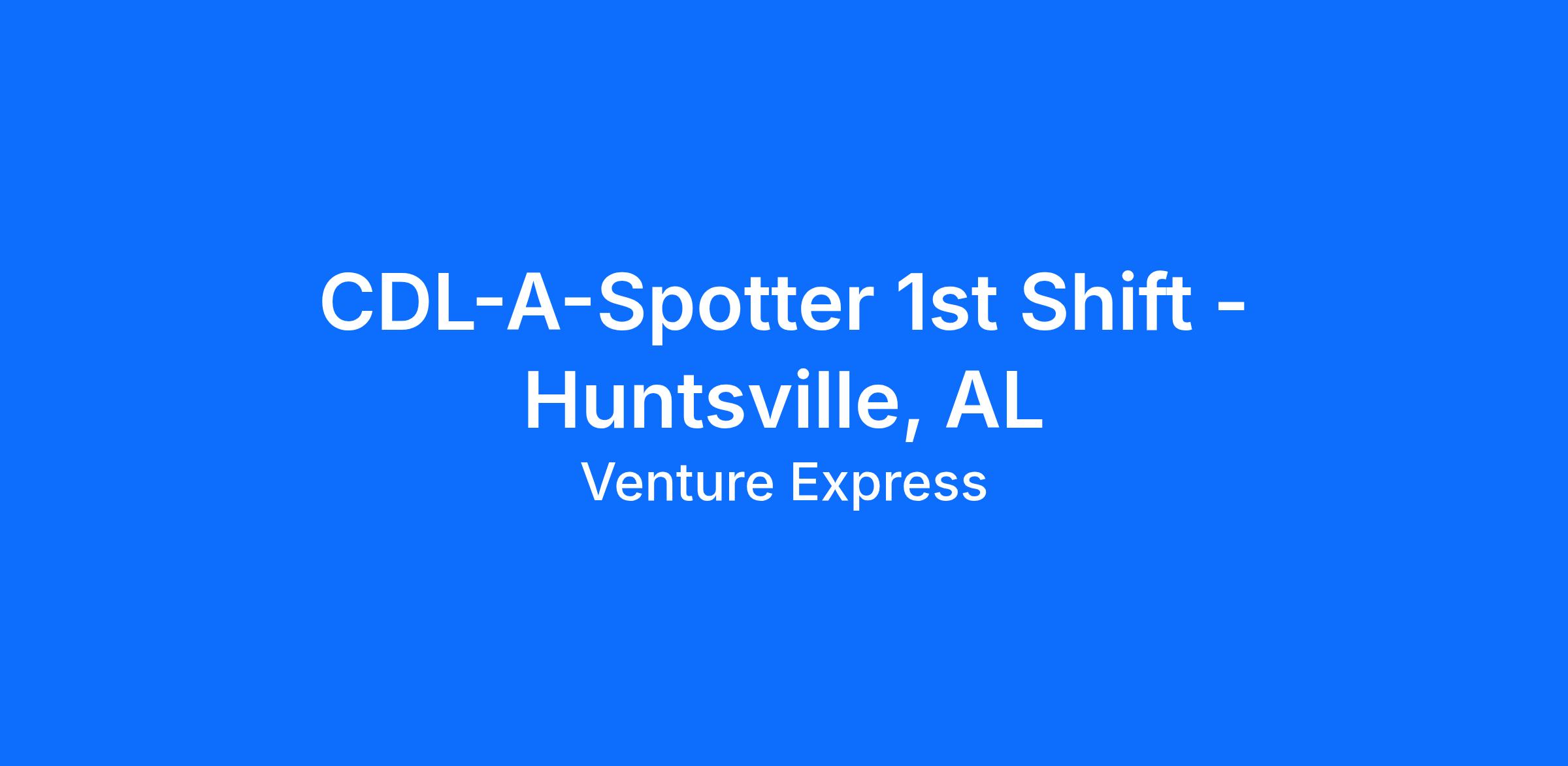 Domicile:Huntsville, ALVE SouthSpotter - 1st ShiftSwitching, Shuttling & Local Plant MovesStarting at $20.50 per hour with a $0.50 increase every 6 months up to $22.50 per hour plus OVERTIME (After 40)Pay Details:$20.50 - $22.50, with $0.50 increase every 6 months up to top outHoliday Pay is $160 per day, eligible after 60 days of employment.$0.01 per mile Safety Bonus eligible, paid monthly. Safety Bonus is subject to successfully completing all Safety Bonus eligibility requirements.Anniversary bonus of $1,200 paid after each year of service6th day may be required when requested by our customerOvertime Eligible BenefitsWeekly direct deposit3 Blue Cross/Blue Shield of TN medical options to choose from starting as low as $30.00 per week for single coverage & $85.00 per week for familyIndividual and family medical plans available with multiple tiersHSA and FSA account optionsDental and vision plans with DeltaCompany paid life insurance of $25,000Two-day in class paid orientation, lunch provided. Third-day Ride-A-Long at home Terminal401K retirement planWork Life Matters Employee Assistance ProgramVoluntary enrollment options for disability, accident and critical care insurance policies availableCoverage for benefit plans are effective on the first of the month following 60 days of employmentAnniversary bonus of $1,200 paid after each year of serviceQualifications:Must have a valid Class A CDL Interstate drivers license.Must pass a DOT physical from one of our chosen FMCSA qualified clinics.Must pass a pre-employment drug screen.Must be able to operate a CMV on public roadways.Must be 23 years or older.No Felony convictions, pled "guilty" to or "No Contest" to crimes involving violence, dishonesty or drugs in the past 10 years.No failed DOT drug or alcohol tests. No Refusals. No Applicants from SAP Program.No DUI convictions, open container, or alcohol related incidents in previous 7 years.No Careless driving or reckless driving convictions on MVR or PSP in the previous 3 years.No at fault rear end collisions, rollover accidents, or jackknife accidents in the previous 3 years.12 months experience in the past 3 years pulling a 53 ft van if for van fleet of which 12 months.No more than a combination of 3 qualifications below: No more than 2 at fault accidents in the previous 3 years and No more than 2 moving violations in the previous 3 years.An acceptable PSP report; Combination of 4 or more violations, inspections, or warnings MUST be reviewed and approved by safety.No speeding convictions of 15 mph or more over the posted speed limit in the previous 3 years.Required to have 10 years of experience filled out; If there is a gap of 6 months or more of employment, then we must have a signed Employment of Declaration document.Verify 3 years of Class A CDL driving experience.Three or more jobs in the last 12 months goes to auditNo convictions for using a handheld device while driving subject to state and/or federal lawMust be able to pass a road test administered by Venture ExpressMust meet all qualifications in section 391.11 of the FMCSA regulations handbookPrimary residence must be within: (Home Daily/Local) a 50-mile commute from the Domicile assigned on hire date. (OTR/Regional) a 100-mile commute from the Domicile assigned on hire date About Venture Express, Inc.Venture Express, Inc. wants a team of world-class Company Drivers like you, and that's exactly the way you deserve to be treated. Whether you live for the open highways or the city streets, adventuring for days, or coming home every night, Venture Express, Inc. has a career opportunity as a company truck driver suited perfectly for you. You will be recognized and rewarded for your accomplishments as a professional company truck driver while operating top-notch equipment. Are you ready to start your driving career with Venture Express Inc.? We invite you to FUEL your Class A CDL career with Venture Express, Inc. today. Venture Express, Inc. is an equal employment opportunity employer. As such, Venture Express, Inc. offers equal employment opportunities without regard to race, color, religion, sex (including pregnancy), national origin, age, disability, genetic information, veteran status, or any other status protected by law. These opportunities include all terms, conditions and privileges of employment, including but not limited to recruitment, selection, hiring, job placement, training, compensation, discipline, discharge, advancement and termination. Venture Express, Inc. does not give hiring preference to applicants based on the previously listed characteristics.