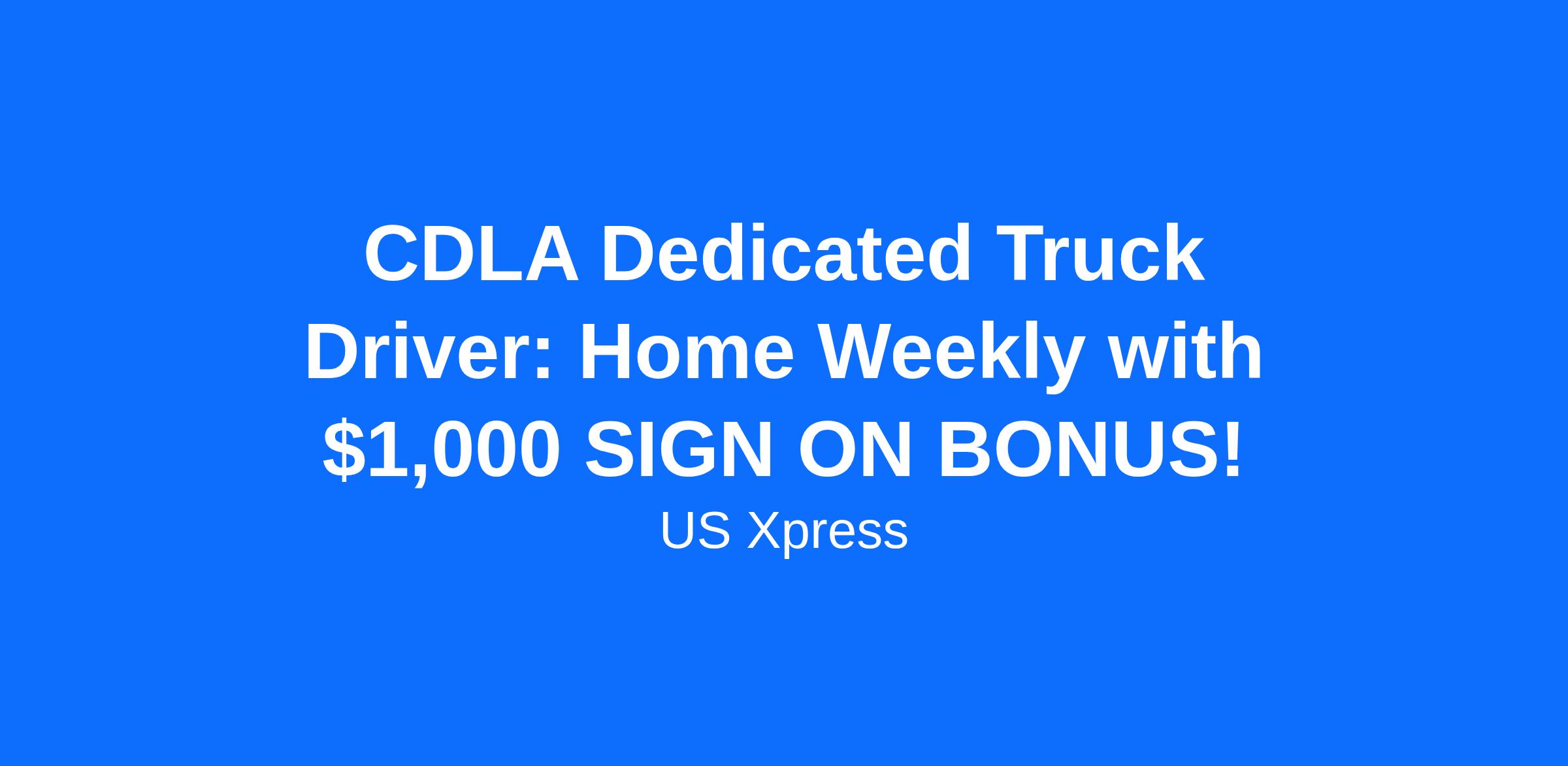 CDLA Dedicated Truck Driver: Home Weekly with $1,000 SIGN ON BONUS!Average $1,500+ per week and No UnloadingApply Online or Call 855-###-#### Today!U.S. Xpress is offering a dedicated opportunity with plenty of freight: \- Average $1\,500\+ per week \- $1\,000 Sign On Bonus \- Home Weekly - 100% No Touch Freight \- Paid Vacation Call or apply today!Benefits: