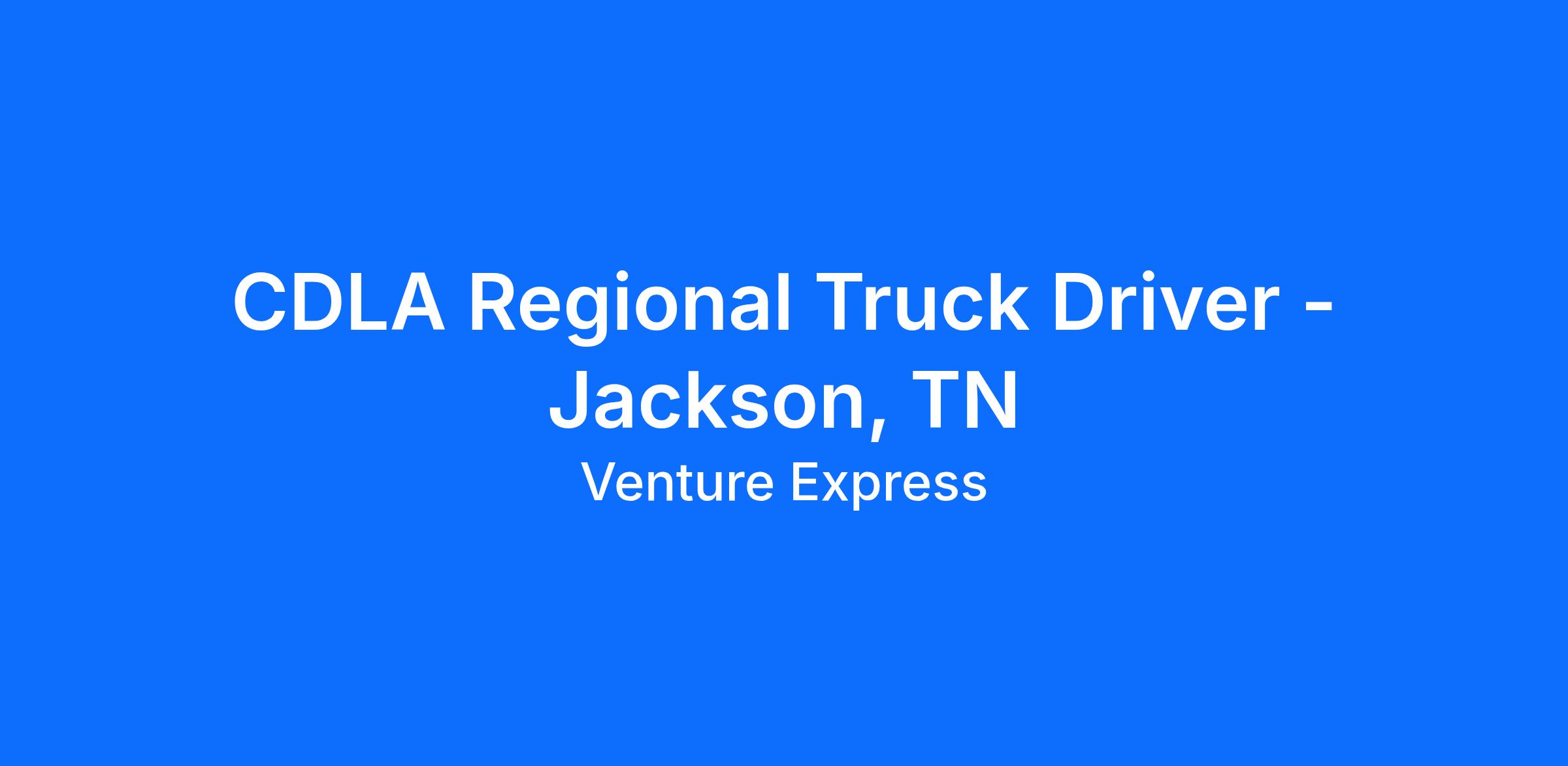 Jackson, TN Semi-Local/Regional - Home Every Other Day - Up to $93,000/yr!12 months of CDL-A experience required - pay raises every 6 months! Domicile: Jackson, TNTerminal: Jackson, TNLong Description: Short Pay Description: Home Time: Semi-Local - Home Every Other Day.Pay Details:Regional Drivers Average $78,000 - $93,000 Annually.Multiple Home Times Available to Fit Your Schedule$1000 Referral Bonus to the Driver and The Referred DriverNo-Touch FreightDrop & Hook FreightPer Diem available401(k)Paid orientationIndividual and Family medical plansMedical options as low as $30 per weekOperational DetailsDedicated customers with consistent routes supporting the automotive industryDrop and hook no-touch freightSlip Seat PositionMultiple start times are available to fit your scheduleAdvanced technology for electronic logs and dispatchInward/Outward facing camerasNo Rider and No Pet PolicyBenefits:Weekly direct deposit3 Blue Cross/Blue Shield of TN medical options to choose from starting as low as $30.00 per week for single coverage & $85.00 per week for familyIndividual and family medical plans available with multiple tiersHSA and FSA account optionsDental and vision plans with DeltaCompany paid life insurance of $25,000Two-day in class paid orientation, lunch provided. Third-day Ride-A-Long at home Terminal401K retirement planWork Life Matters Employee Assistance ProgramVoluntary enrollment options for disability, accident and critical care insurance policies availableCoverage for benefit plans are effective on the first of the month following 60 days of employment CDL A Best in class benefits, better home time for kids and family, more money, less stress! 12 months of CDL-A experience requiredMust pass a DOT physical from one of our chosen FMCSA-qualified clinics.Must pass a pre-employment drug screen.Must be able to operate a CMV on public roadways.Must be 23 years or older.No Felony convictions, pled "guilty" to or "No Contest" to crimes involving violence, dishonesty or drugs in the past 10 years.No failed DOT drug or alcohol tests. No Refusals. No Applicants from SAP Program.No DUI convictions, open container, or alcohol related incidents in previous 7 years.No Careless driving or reckless driving convictions on MVR or PSP in the previous 3 years.No at fault rear end collisions, rollover accidents, or jackknife accidents in the previous 3 years.12 months experience in the past 3 years pulling a 53 ft van if for van fleet of which 12 months.No more than a combination of 3 qualifications below: No more than 2 at fault accidents in the previous 3 years and No more than 2 moving violations in the previous 3 years.An acceptable PSP report; Combination of 4 or more violations, inspections, or warnings MUST be reviewed and approved by safety.No speeding convictions of 15 mph or more over the posted speed limit in the previous 3 years.Required to have 10 years of experience filled out; If there is a gap of 6 months or more of employment, then we must have a signed Employment of Declaration document.Verify 3 years of Class A CDL driving experience.Three or more jobs in the last 12 months go to auditNo convictions for using a handheld device while driving subject to state and/or federal lawMust be able to pass a road test administered by Venture ExpressMust meet all qualifications in section 391.11 of the FMCSA regulations handbookPrimary residence must be within: (Home Daily/Local) a 50-mile commute from the Domicile assigned on hire date. (OTR/Regional) a 100-mile commute from the Domicile assigned on hire date. About Venture Express, Inc.Venture Express, Inc. wants a team of world-class Company Drivers like you, and that's exactly the way you deserve to be treated. Whether you live for the open highways or the city streets, adventuring for days, or coming home every night, Venture Express, Inc. has a career opportunity as a company truck driver suited perfectly for you. You will be recognized and rewarded for your accomplishments as a professional company truck driver while operating top-notch equipment. Are you ready to start your driving career with Venture Express Inc.? We invite you to FUEL your Class A CDL career with Venture Express, Inc. today. Venture Express, Inc. is an equal employment opportunity employer. As such, Venture Express, Inc. offers equal employment opportunities without regard to race, color, religion, sex (including pregnancy), national origin, age, disability, genetic information, veteran status, or any other status protected by law. These opportunities include all terms, conditions and privileges of employment, including but not limited to recruitment, selection, hiring, job placement, training, compensation, discipline, discharge, advancement and termination. Venture Express, Inc. does not give hiring preference to applicants based on the previously listed characteristics.