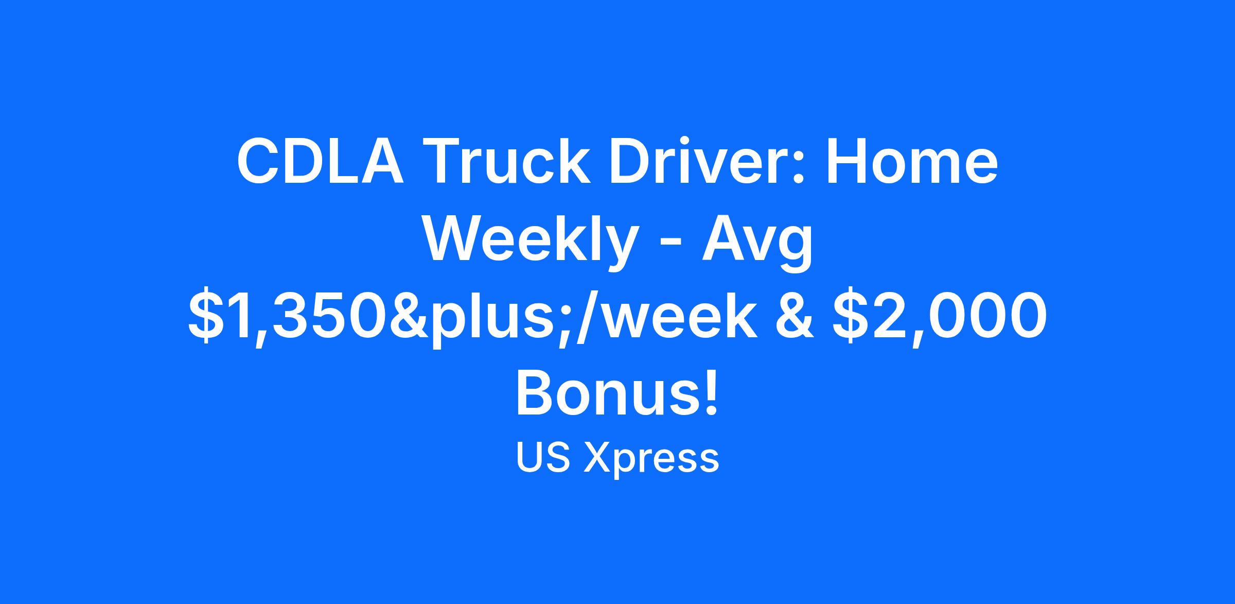 CDLA Truck Driver: Home Weekly - Avg $1,350+/week & $2,000 Bonus!No Unloading & Great BenefitsApply Online or Call 855-###-#### Today!U.S. Xpress is offering a dedicated opportunity with plenty of freight: \- Average $1\,350\+ per week \ - Avg $70k annually \- $2\,000 Sign On Bonus \- Home Weekly \- Average 1\,350\+ miles per week - 100% No Touch Freight \- Paid Vacation Call or apply today!Benefits: