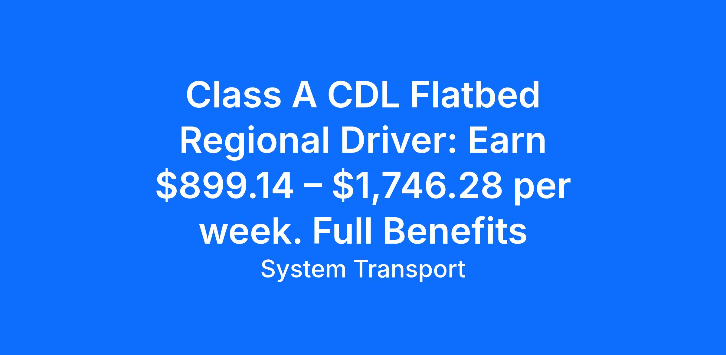 CDL A Flatbed Regional Driver - Western Route: $899.14 – $1,746.28 per week. Full BenefitsAMERICA PROUD. FLATBED STRONG. DRIVE SYSTEM TRANSPORT!Looking for an exciting driving opportunity in the western region of America? System Transport is hiring experienced CDL-A flatbed truck drivers for regional and OTR routes. As a driver, you will be transporting important goods and materials such as glass, steel, aluminum, building materials, machinery, coils, and specialty metals. We offer competitive pay packages and excellent benefits. Join our team and become America Proud, Flatbed Strong with System Transport. Don't wait, apply now!