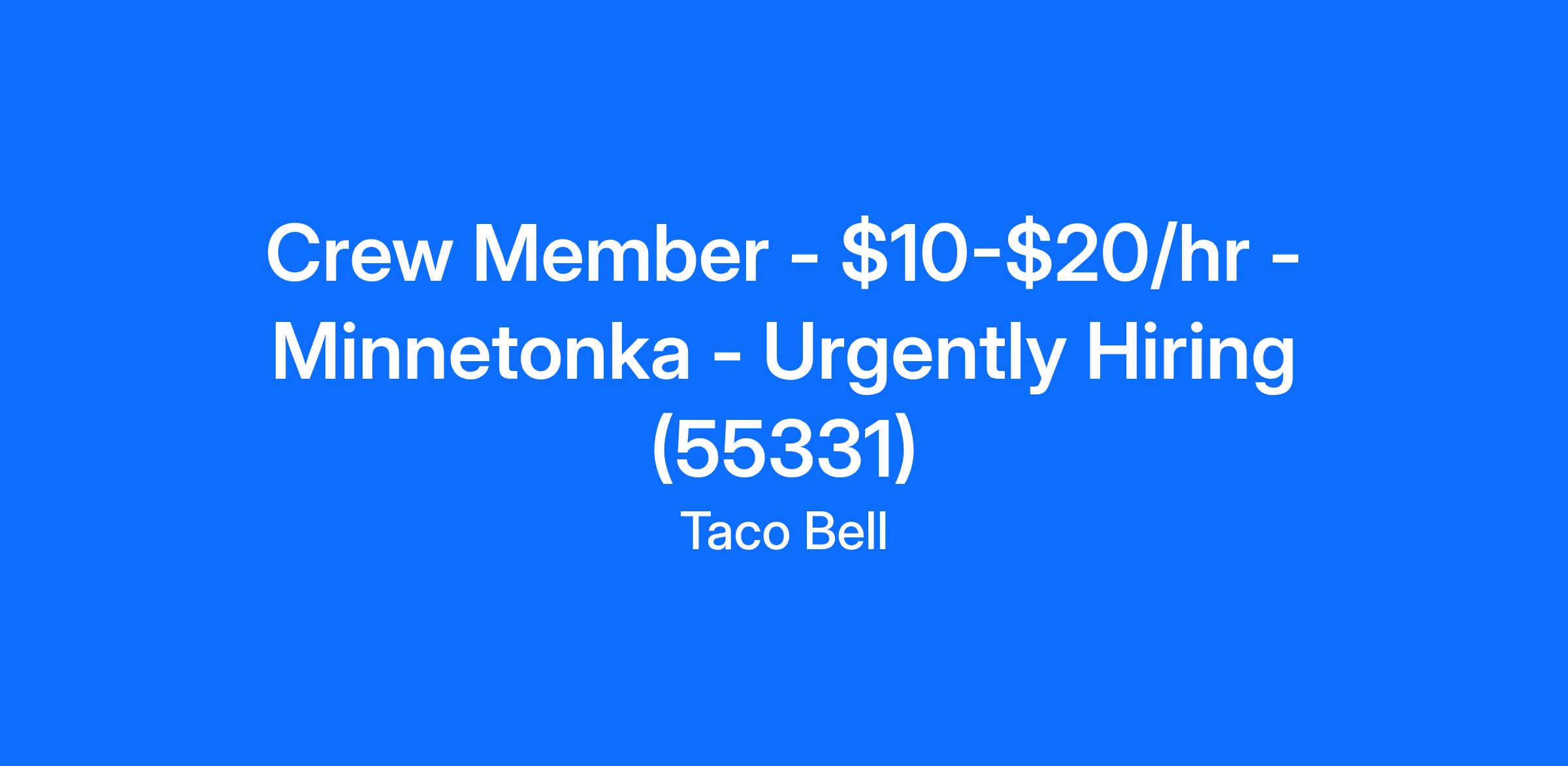 Taco Bell - Minnetonka is looking for a full time or part time crew member to join our team in Minnetonka, MN. As a Taco Bell - Minnetonka crew member, you can be the smiling face that greets and serves our guests or a cook who makes things happen in the kitchen. Working with us will give you the flexibility to be whatever our team and guests needs you to be. You'll learn new things, get recognized for your efforts and learn skills that last a lifetime.