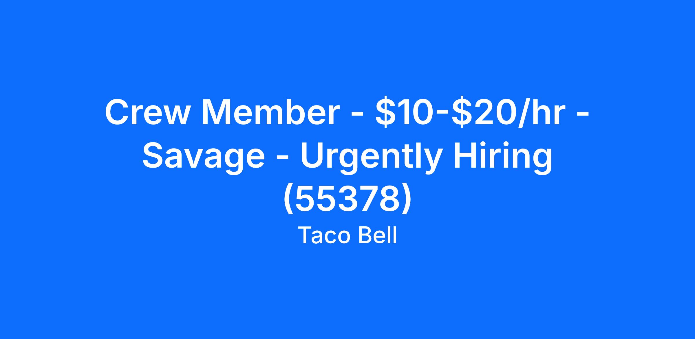 Taco Bell - Savage is looking for a full time or part time crew member to join our team in Savage, MN. As a Taco Bell - Savage crew member, you can be the smiling face that greets and serves our guests or a cook who makes things happen in the kitchen. Working with us will give you the flexibility to be whatever our team and guests needs you to be. You'll learn new things, get recognized for your efforts and learn skills that last a lifetime.