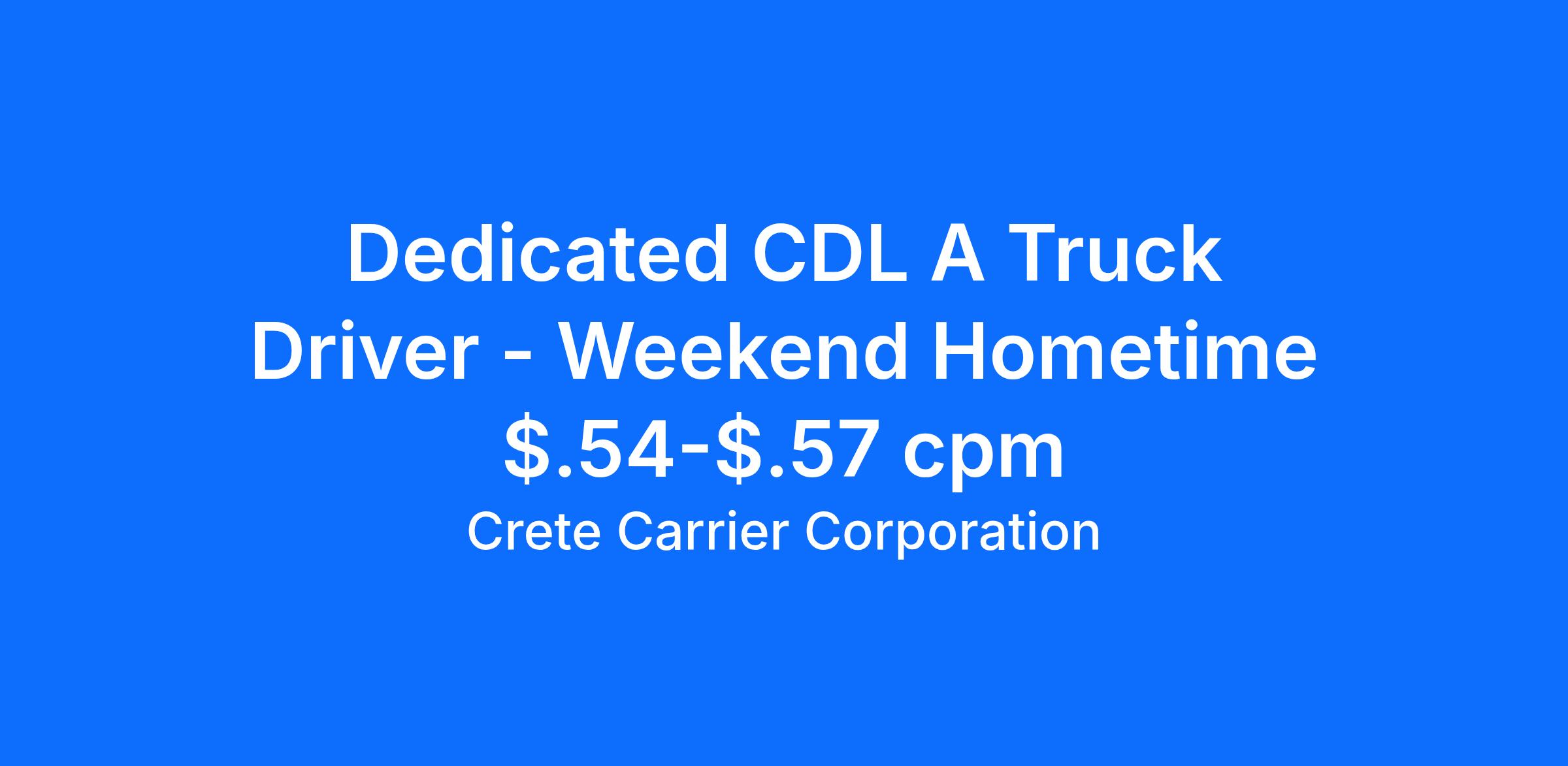 Crete Carrier offers CDL A Drivers a Dedicated Route and Home WeekendsSalary: $74,000CPM: Starting pay $.54 to $.57 CPMExperience: One-year verifiable tractor trailer experience with a class A CDL WHY CHOOSE CRETE CARRIER?At Crete Carrier and Shaffer Trucking, our miles are up significantly. In fact, we need more safe, experienced drivers to meet the needs of our customers. Crete, Shaffer, and Hunt drivers are paid based on practical miles. This means drivers are paid for 3-5 percent more total miles per year than companies that pay based on short route miles. Another added incentive is that those practical miles roll in faster now that we've recently raised our governed truck speed to 68 MPH on the cruise and 65 MPH on the pedal. The most productive 50 percent of our Crete Carrier and Shaffer Trucking OTR drivers average more than $96,542 annually. That equates to over $1,856 weekly; $.61 to $.64 CPM. The top 50% of our Hunt Transportation drivers average $93,347 annually ($1,795 per week), with starting pay ranging from $0.61 to $0.68 per mile. We also offer comprehensive and affordable health insurance, matching 401k and a profit-sharing plan that contributed $11 million in 2024 and more than $91.5 million to employee retirement accounts since 2018. AT CRETE, SHAFFER, AND HUNT, INDUSTRY LEADING PAY IS JUST THE BEGINNING WHAT IS LEADING PAY PLUS?Leading Pay Plus includes the industry leading pay that Crete Carrier Corporation is known for plus the extras which add more to a driver's bottom line, improve a driver's quality of life, and help a driver succeed in their profession. Take a few minutes to see how our Leading Pay Plus program stacks up against your current situation. We believe you'll choose Crete Carrier and Shaffer Trucking. About Crete CarrierOver the past 50 years, Crete Carrier has grown to one of the nation's largest, privately owned trucking companies. Along with sister company, Shaffer Trucking, and wholly-owned subsidiary Hunt Transportation, Crete Carrier Corporation operates as a truckload and flatbed carrier for virtually any commodity. Our drivers are among the best, exceeding the CSA score standards required by the U.S. Department of Transportation. Crete Carrier is a Leading Pay Plus Carrier with industry-leading benefits that include health insurance from BCBS of Nebraska, dental, vision, life, 401K, and a profit-sharing program. Because of this, drivers typically stay with us three times longer than the competition. *Some area restrictions apply.