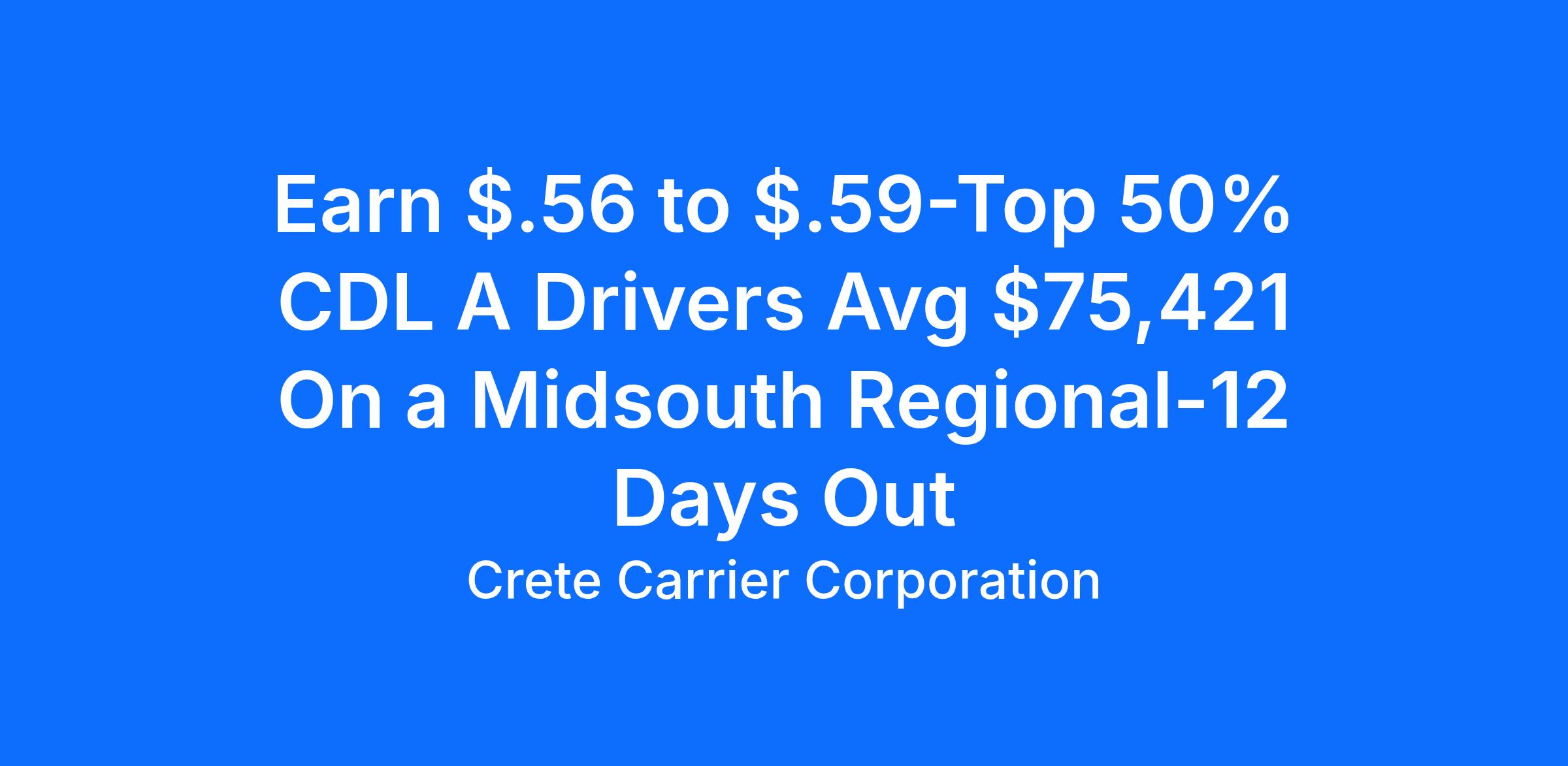 Crete Carrier offers a Regional in the Middle South for CDL A Drivers.Salary: $75,421CPM: Starting pay $.56 to $.59 CPMExperience: One-year verifiable tractor trailer experience with a class A CDL WHY CHOOSE CRETE CARRIER?At Crete Carrier and Shaffer Trucking, our miles are up significantly. In fact, we need more safe, experienced drivers to meet the needs of our customers. Crete, Shaffer, and Hunt drivers are paid based on practical miles. This means drivers are paid for 3-5 percent more total miles per year than companies that pay based on short route miles. Another added incentive is that those practical miles roll in faster now that we've recently raised our governed truck speed to 68 MPH on the cruise and 65 MPH on the pedal. The most productive 50 percent of our Crete Carrier and Shaffer Trucking OTR drivers average more than $96,542 annually. That equates to over $1,856 weekly; $.61 to $.64 CPM. The top 50% of our Hunt Transportation drivers average $93,347 annually ($1,795 per week), with starting pay ranging from $0.61 to $0.68 per mile. We also offer comprehensive and affordable health insurance, matching 401k and a profit-sharing plan that contributed $11 million in 2024 and more than $91.5 million to employee retirement accounts since 2018. AT CRETE, SHAFFER, AND HUNT, INDUSTRY LEADING PAY IS JUST THE BEGINNING WHAT IS LEADING PAY PLUS?Leading Pay Plus includes the industry leading pay that Crete Carrier Corporation is known for plus the extras which add more to a driver's bottom line, improve a driver's quality of life, and help a driver succeed in their profession. Take a few minutes to see how our Leading Pay Plus program stacks up against your current situation. We believe you'll choose Crete Carrier and Shaffer Trucking. About Crete CarrierOver the past 50 years, Crete Carrier has grown to one of the nation's largest, privately owned trucking companies. Along with sister company, Shaffer Trucking, and wholly-owned subsidiary Hunt Transportation, Crete Carrier Corporation operates as a truckload and flatbed carrier for virtually any commodity. Our drivers are among the best, exceeding the CSA score standards required by the U.S. Department of Transportation. Crete Carrier is a Leading Pay Plus Carrier with industry-leading benefits that include health insurance from BCBS of Nebraska, dental, vision, life, 401K, and a profit-sharing program. Because of this, drivers typically stay with us three times longer than the competition. *Some area restrictions apply.