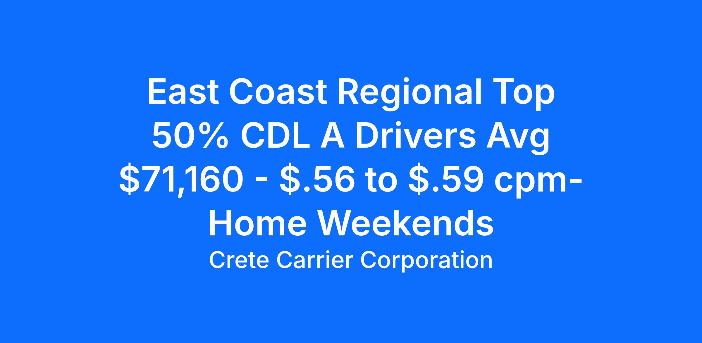 Crete Carrier offers home weekends running an East Coast regional.Salary: Top 50% average $71,160 per yearCPM: Starting pay $.56 to $.59 cpmExperience: One-year verifiable tractor trailer experience with a class A CDL WHY CHOOSE CRETE CARRIER?At Crete Carrier and Shaffer Trucking, our miles are up significantly. In fact, we need more safe, experienced drivers to meet the needs of our customers. Crete, Shaffer, and Hunt drivers are paid based on practical miles. This means drivers are paid for 3-5 percent more total miles per year than companies that pay based on short route miles. Another added incentive is that those practical miles roll in faster now that we've recently raised our governed truck speed to 68 MPH on the cruise and 65 MPH on the pedal. The most productive 50 percent of our Crete Carrier and Shaffer Trucking OTR drivers average more than $96,542 annually. That equates to over $1,856 weekly; $.61 to $.64 CPM. The top 50% of our Hunt Transportation drivers average $93,347 annually ($1,795 per week), with starting pay ranging from $0.61 to $0.68 per mile. We also offer comprehensive and affordable health insurance, matching 401k and a profit-sharing plan that contributed $11 million in 2024 and more than $91.5 million to employee retirement accounts since 2018. AT CRETE, SHAFFER, AND HUNT, INDUSTRY LEADING PAY IS JUST THE BEGINNING WHAT IS LEADING PAY PLUS?Leading Pay Plus includes the industry leading pay that Crete Carrier Corporation is known for plus the extras which add more to a driver's bottom line, improve a driver's quality of life, and help a driver succeed in their profession. Take a few minutes to see how our Leading Pay Plus program stacks up against your current situation. We believe you'll choose Crete Carrier and Shaffer Trucking. About Crete CarrierOver the past 50 years, Crete Carrier has grown to one of the nation's largest, privately owned trucking companies. Along with sister company, Shaffer Trucking, and wholly-owned subsidiary Hunt Transportation, Crete Carrier Corporation operates as a truckload and flatbed carrier for virtually any commodity. Our drivers are among the best, exceeding the CSA score standards required by the U.S. Department of Transportation. Crete Carrier is a Leading Pay Plus Carrier with industry-leading benefits that include health insurance from BCBS of Nebraska, dental, vision, life, 401K, and a profit-sharing program. Because of this, drivers typically stay with us three times longer than the competition. *Some area restrictions apply.