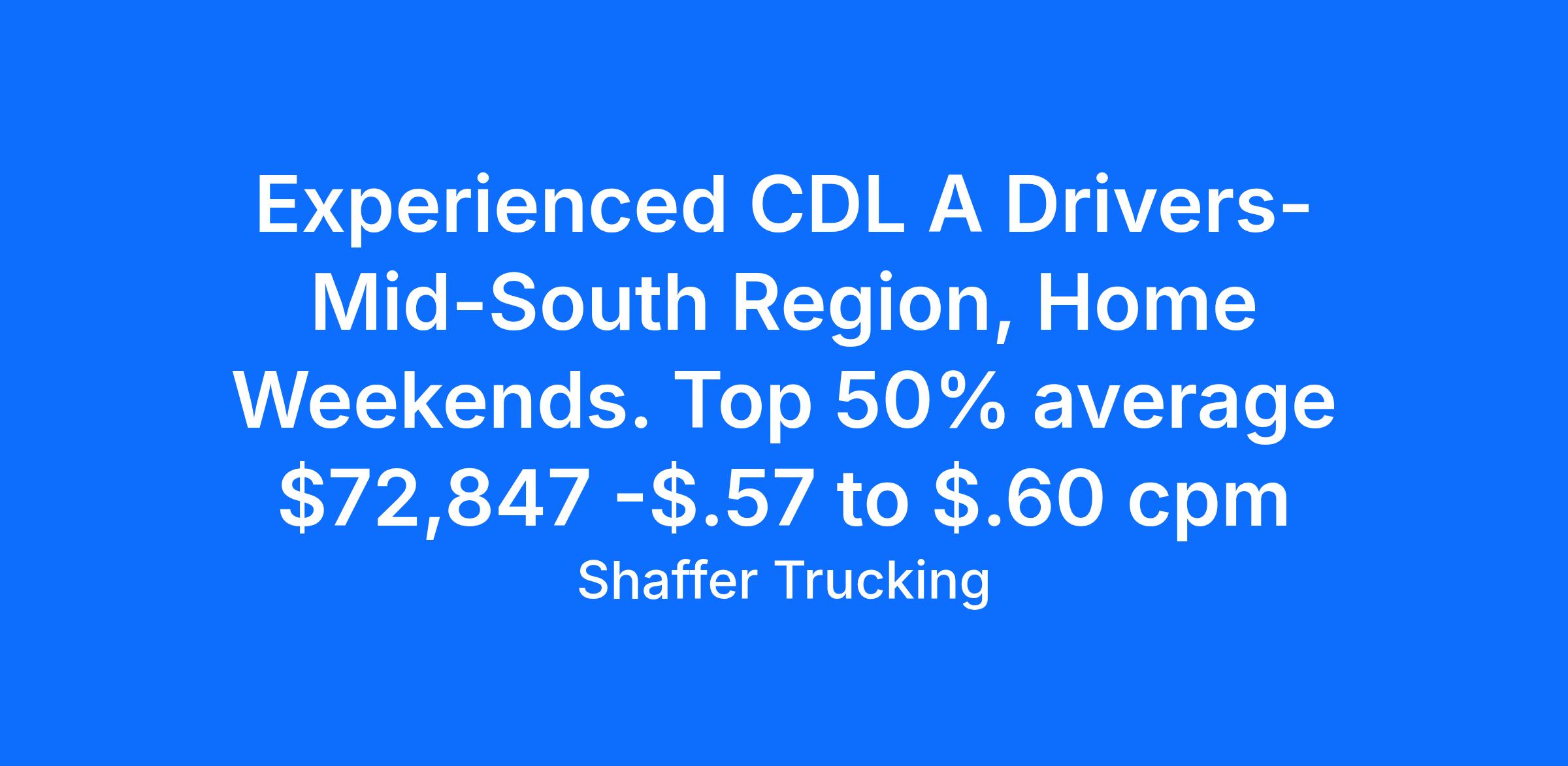 Shaffer Trucking offers home weekends with the Mid-South Region fleet.Salary: Top 50% average $72,847 per yearCPM: Starting pay $.57 to $.60 cpmExperience: One-year verifiable tractor trailer experience with a class A CDL WHY CHOOSE SHAFFER TRUCKING?At Crete Carrier and Shaffer Trucking, our miles are up significantly. In fact, we need more safe, experienced drivers to meet the needs of our customers. Crete, Shaffer, and Hunt drivers are paid based on practical miles. This means drivers are paid for 3-5 percent more total miles per year than companies that pay based on short route miles. Another added incentive is that those practical miles roll in faster now that we've recently raised our governed truck speed to 68 MPH on the cruise and 65 MPH on the pedal. The most productive 50 percent of our Crete Carrier and Shaffer Trucking OTR drivers average more than $96,542 annually. That equates to over $1,856 weekly; $.63 to $.66 CPM. The top 50% of our Hunt Transportation drivers average $93,347 annually ($1,795 per week), with starting pay ranging from $0.61 to $0.68 per mile. We also offer comprehensive and affordable health insurance, matching 401k and a profit-sharing plan that contributed $11 million in 2024 and more than $91.5 million to employee retirement accounts since 2018. AT CRETE, SHAFFER, AND HUNT, INDUSTRY LEADING PAY IS JUST THE BEGINNING WHAT IS LEADING PAY PLUS?Leading Pay Plus includes the industry leading pay that Crete Carrier Corporation is known for plus the extras which add more to a driver's bottom line, improve a driver's quality of life, and help a driver succeed in their profession. Take a few minutes to see how our Leading Pay Plus program stacks up against your current situation. We believe you'll choose Crete Carrier and Shaffer Trucking. About Crete CarrierOver the past 50 years, Crete Carrier has grown to one of the nation's largest, privately owned trucking companies. Along with sister company, Shaffer Trucking, and wholly-owned subsidiary Hunt Transportation, Crete Carrier Corporation operates as a truckload and flatbed carrier for virtually any commodity. Our drivers are among the best, exceeding the CSA score standards required by the U.S. Department of Transportation. Crete Carrier is a Leading Pay Plus Carrier with industry-leading benefits that include health insurance from BCBS of Nebraska, dental, vision, life, 401K, and a profit-sharing program. Because of this, drivers typically stay with us three times longer than the competition. *Some area restrictions apply.