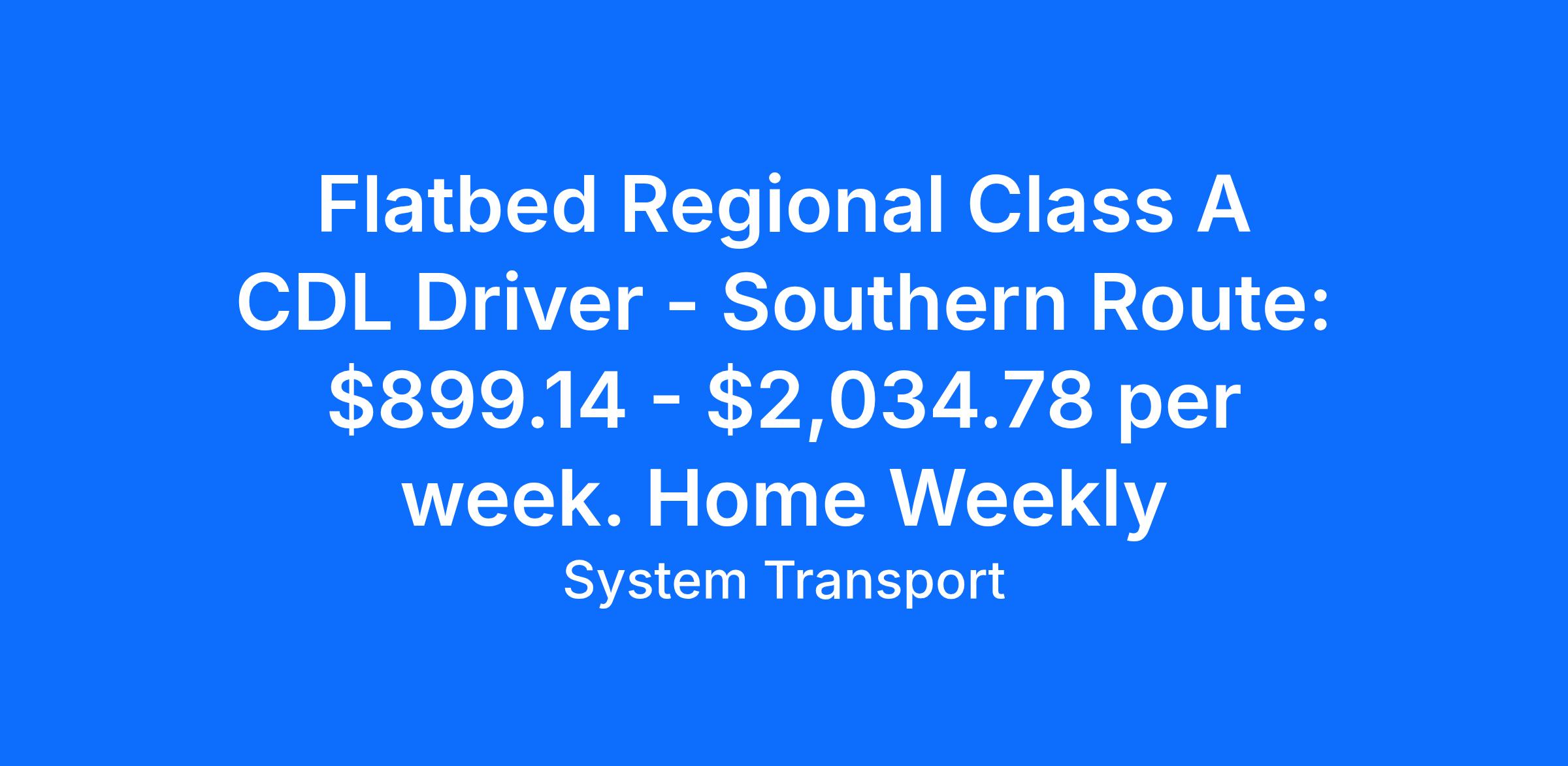 Flatbed Regional Class A CDL Driver - Southern Route: $899.14 - $2,034.78 per week. Home Weekly