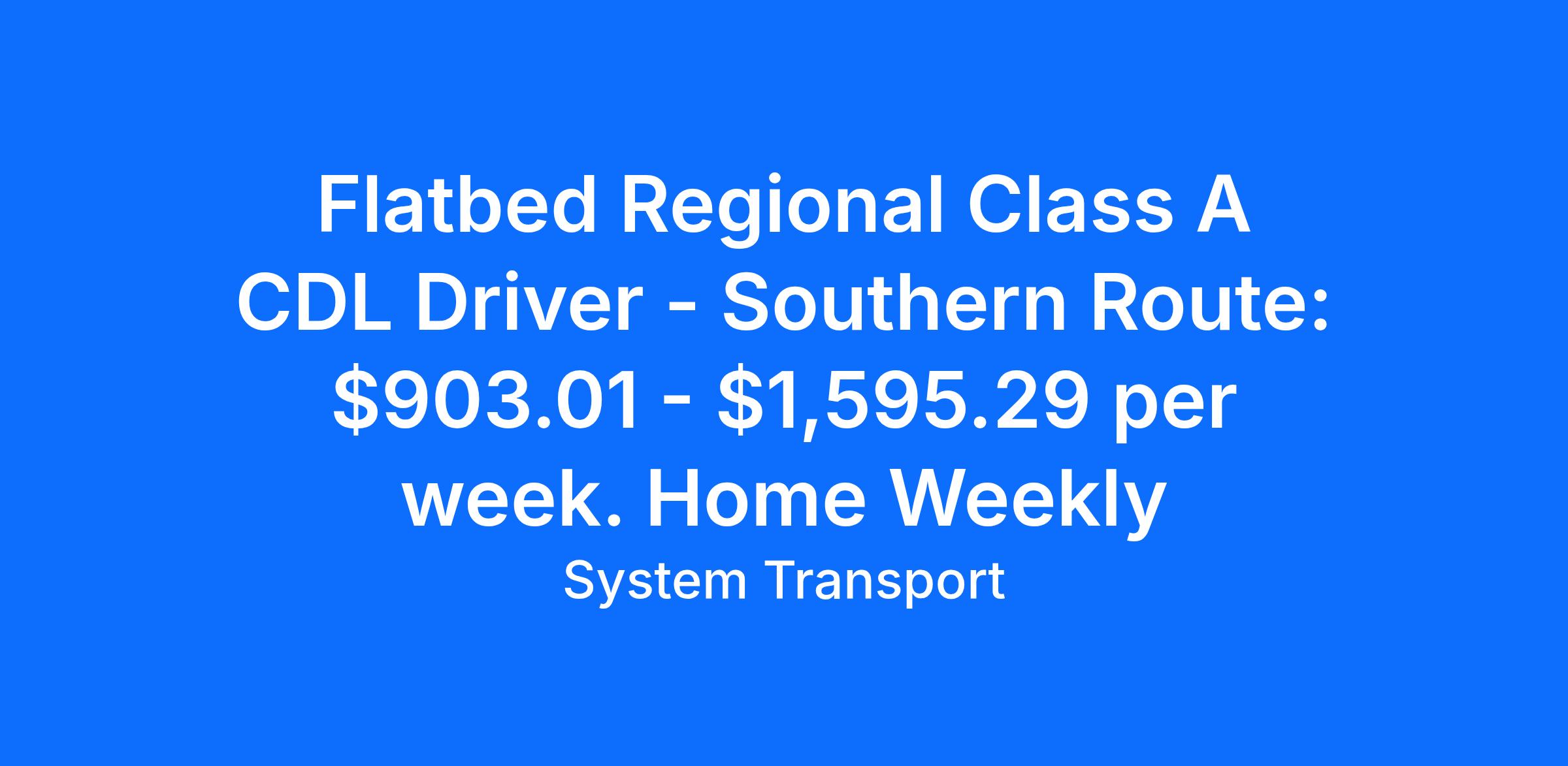 Job Description:Flatbed CDL Driver, Regional Route: $903.01 - $1,595.29 per week. Home WeeklyAMERICA PROUD. FLATBED STRONG. DRIVE SYSTEM TRANSPORT!Looking for an exciting driving opportunity in the western region of America? System Transport is hiring experienced CDL-A flatbed truck drivers for regional and OTR routes. As a driver, you will be transporting important goods and materials such as glass, steel, aluminum, building materials, machinery, coils, and specialty metals. We offer competitive pay packages and excellent benefits. Join our team and become America Proud, Flatbed Strong with System Transport. Don't wait, apply now!