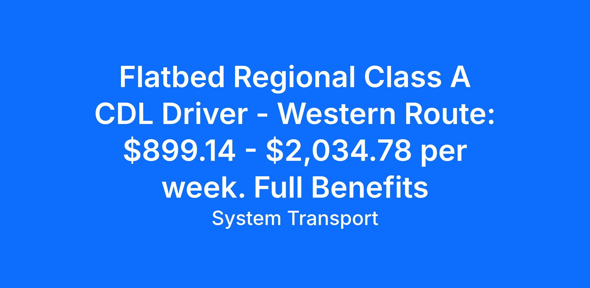 Job Description:Flatbed CDL Driver, All Routes: $899.14 - $2,034.78/per week. Full BenefitsAMERICA PROUD. FLATBED STRONG. DRIVE SYSTEM TRANSPORT!Looking for an exciting driving opportunity in the western region of America? System Transport is hiring experienced CDL-A flatbed truck drivers for all routes! We offer regional, local, dedicated, and OTR routes. As a driver, you will transport important goods and materials such as glass, steel, aluminum, building materials, machinery, coils, and specialty metals. We offer competitive pay packages and excellent benefits. Join our team and become America Proud, Flatbed Strong with System Transport. Don't wait, apply now!