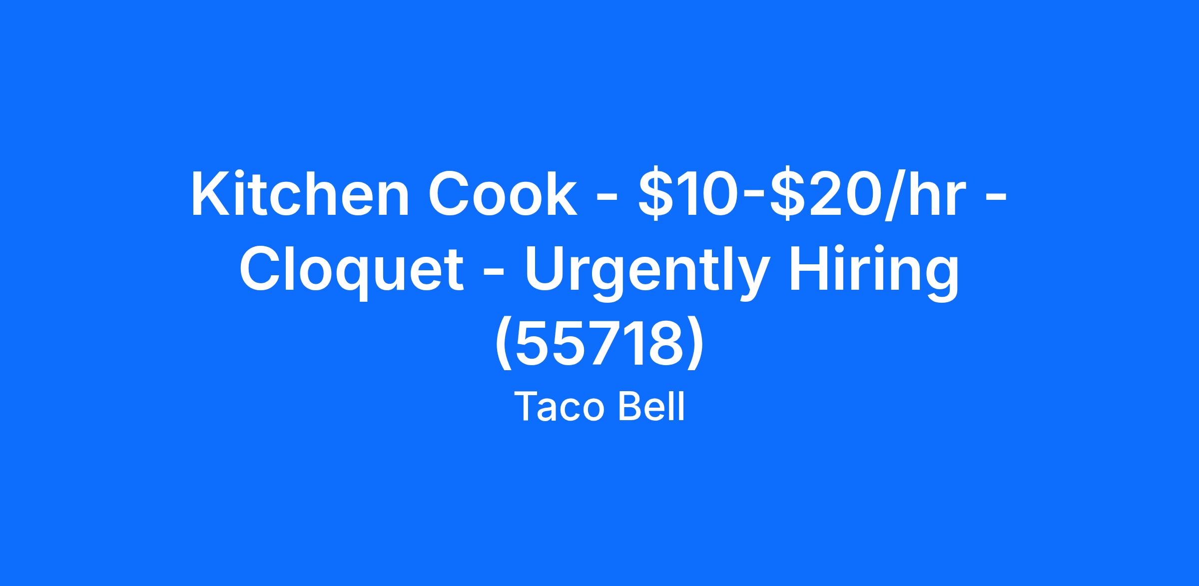 Taco Bell - Cloquet is looking for a hardworking individual to join our kitchen team as a full time or part time Kitchen Cook in Cloquet, MN. As part of the BOH team, you'll be responsible for food preparation that meets or exceeds hospitality and service standards, and must be able to prepare all foods to meet quantity and deadline requirements.