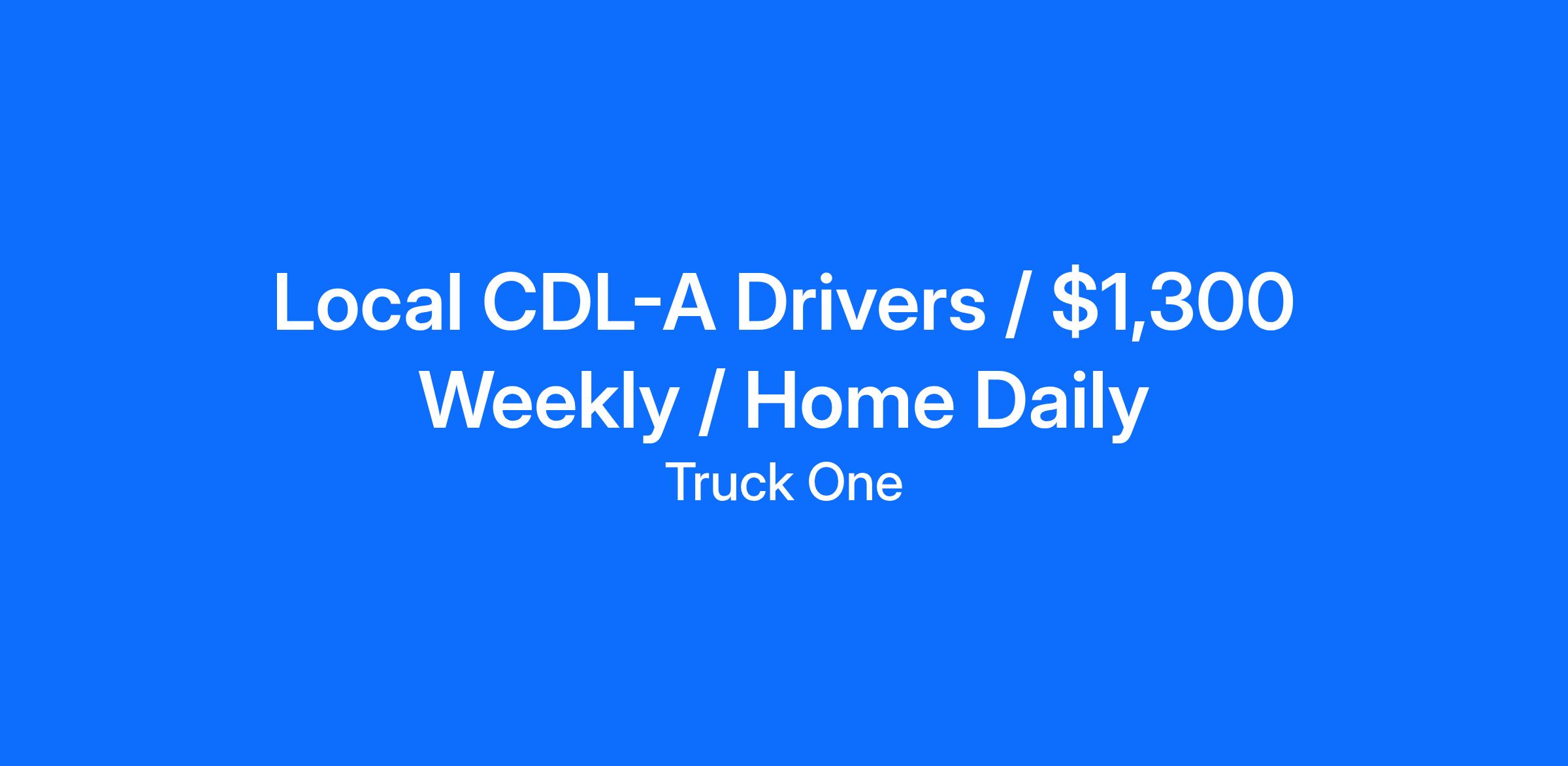 Truck One is Hiring Local Company Drivers. Make $1,300 per week and get home daily! Benefits:$1,300 per weekHome DailyNew/Late Model EquipmentPaid Weekly/Direct DepositTwo Weeks Earned Time OffSix Paid HolidaysMajor Medical Coverage/Vision and DentalRetirement PlanFast and Easy OrientationDriver Referral Bonus ProgramFuel Card ProvidedPre-Pass Provided Requirements:Valid CDL AAt least 1 year of experience About Truck One IncTruck One, Inc. is a family-oriented company providing services to the transportation industry since 1947. We offer many regional lanes to fit your lifestyle. Specializing in quality, on time service, Truck One has built its reputation on the professionalism and reliability of our drivers.Truck One Inc is an Equal Opportunity Employer. All qualified applicants will receive consideration for employment without regard to sex, gender identity, sexual orientation, race, color, religion, national origin, disability, protected Veteran status, age, or any other characteristic protected by applicable law.