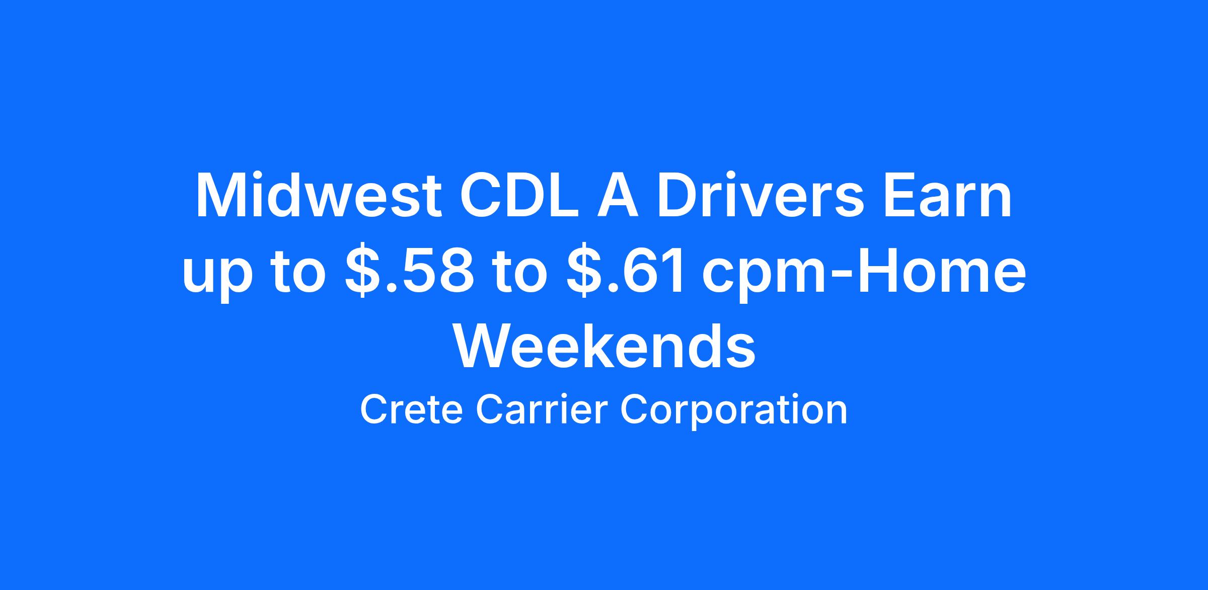 Crete Carrier offers Driving Random Freight Earning up to $75,400.Salary: Top 50% average $75,400 per yearCPM: Starting pay $.58 to $.61 cpmExperience: One-year verifiable tractor trailer experience with a class A CDL WHY CHOOSE CRETE CARRIER?At Crete Carrier and Shaffer Trucking, our miles are up significantly. In fact, we need more safe, experienced drivers to meet the needs of our customers. Crete, Shaffer, and Hunt drivers are paid based on practical miles. This means drivers are paid for 3-5 percent more total miles per year than companies that pay based on short route miles. Another added incentive is that those practical miles roll in faster now that we've recently raised our governed truck speed to 68 MPH on the cruise and 65 MPH on the pedal. The most productive 50 percent of our Crete Carrier and Shaffer Trucking OTR drivers average more than $96,542 annually. That equates to over $1,856 weekly; $.61 to $.64 CPM. The top 50% of our Hunt Transportation drivers average $93,347 annually ($1,795 per week), with starting pay ranging from $0.61 to $0.68 per mile. We also offer comprehensive and affordable health insurance, matching 401k and a profit-sharing plan that contributed $11 million in 2024 and more than $91.5 million to employee retirement accounts since 2018. AT CRETE, SHAFFER, AND HUNT, INDUSTRY LEADING PAY IS JUST THE BEGINNING WHAT IS LEADING PAY PLUS?Leading Pay Plus includes the industry leading pay that Crete Carrier Corporation is known for plus the extras which add more to a driver's bottom line, improve a driver's quality of life, and help a driver succeed in their profession. Take a few minutes to see how our Leading Pay Plus program stacks up against your current situation. We believe you'll choose Crete Carrier and Shaffer Trucking. About Crete CarrierOver the past 50 years, Crete Carrier has grown to one of the nation's largest, privately owned trucking companies. Along with sister company, Shaffer Trucking, and wholly-owned subsidiary Hunt Transportation, Crete Carrier Corporation operates as a truckload and flatbed carrier for virtually any commodity. Our drivers are among the best, exceeding the CSA score standards required by the U.S. Department of Transportation. Crete Carrier is a Leading Pay Plus Carrier with industry-leading benefits that include health insurance from BCBS of Nebraska, dental, vision, life, 401K, and a profit-sharing program. Because of this, drivers typically stay with us three times longer than the competition. *Some area restrictions apply.