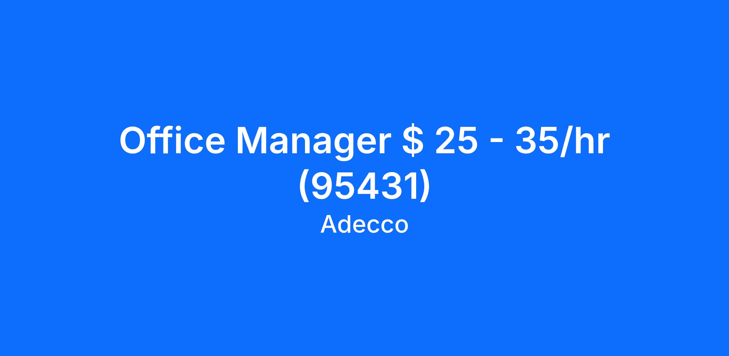 Adecco is currently assisting a local client, recruiting for an Office Manager in Santa Rosa, CA. This Office Manager position has a starting pay range of $25 - $35 per hour. For instant consideration for this Office Manager position, Apply Now!