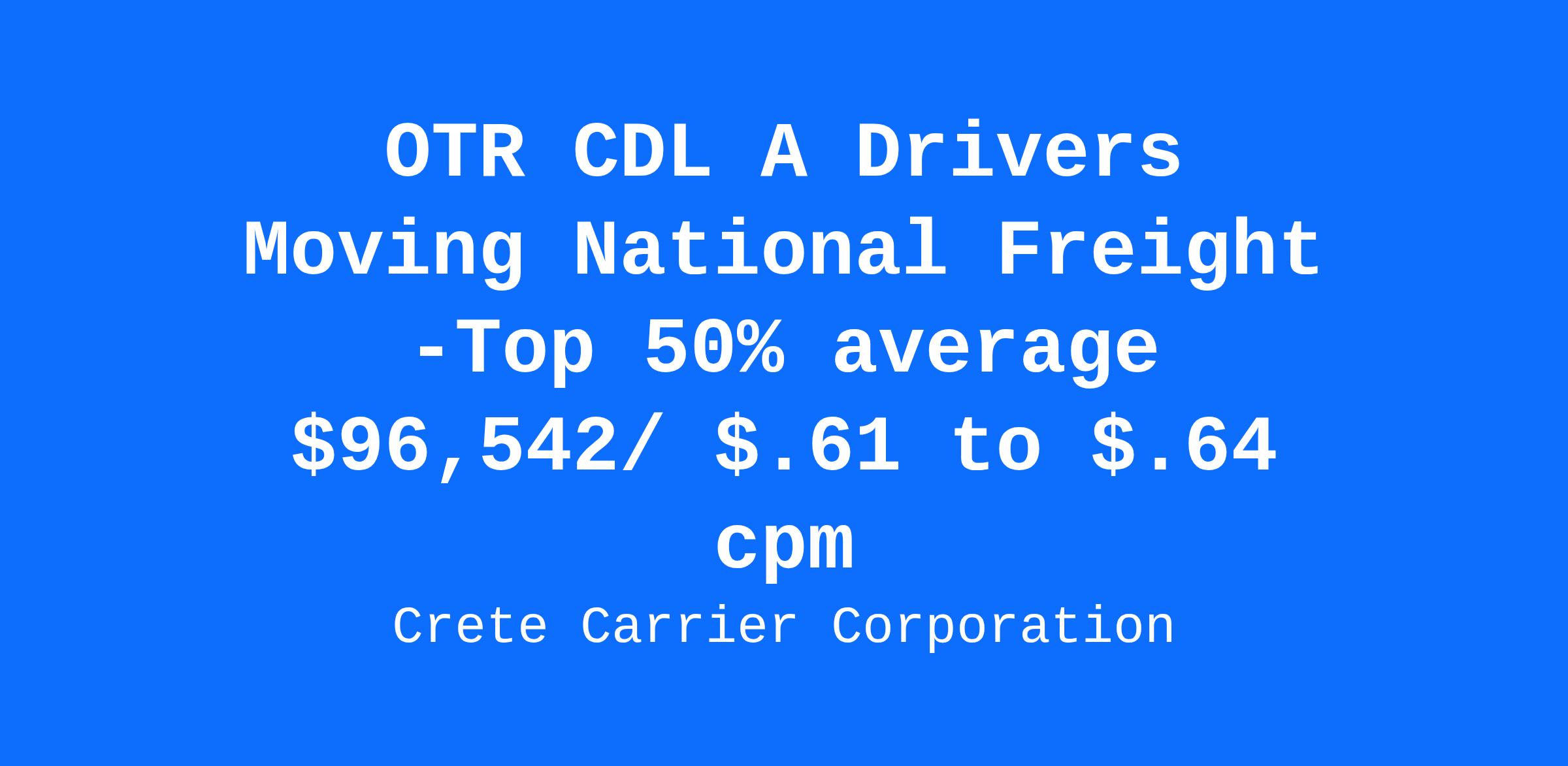 Crete Carrier offers a 21 Days Out. 1 Day Home for Every 6 Days.Salary: Top 50% average $96,542 per yearCPM: Starting pay $.61 to $.64 cpmExperience: One-year verifiable tractor trailer experience with a class A CDL