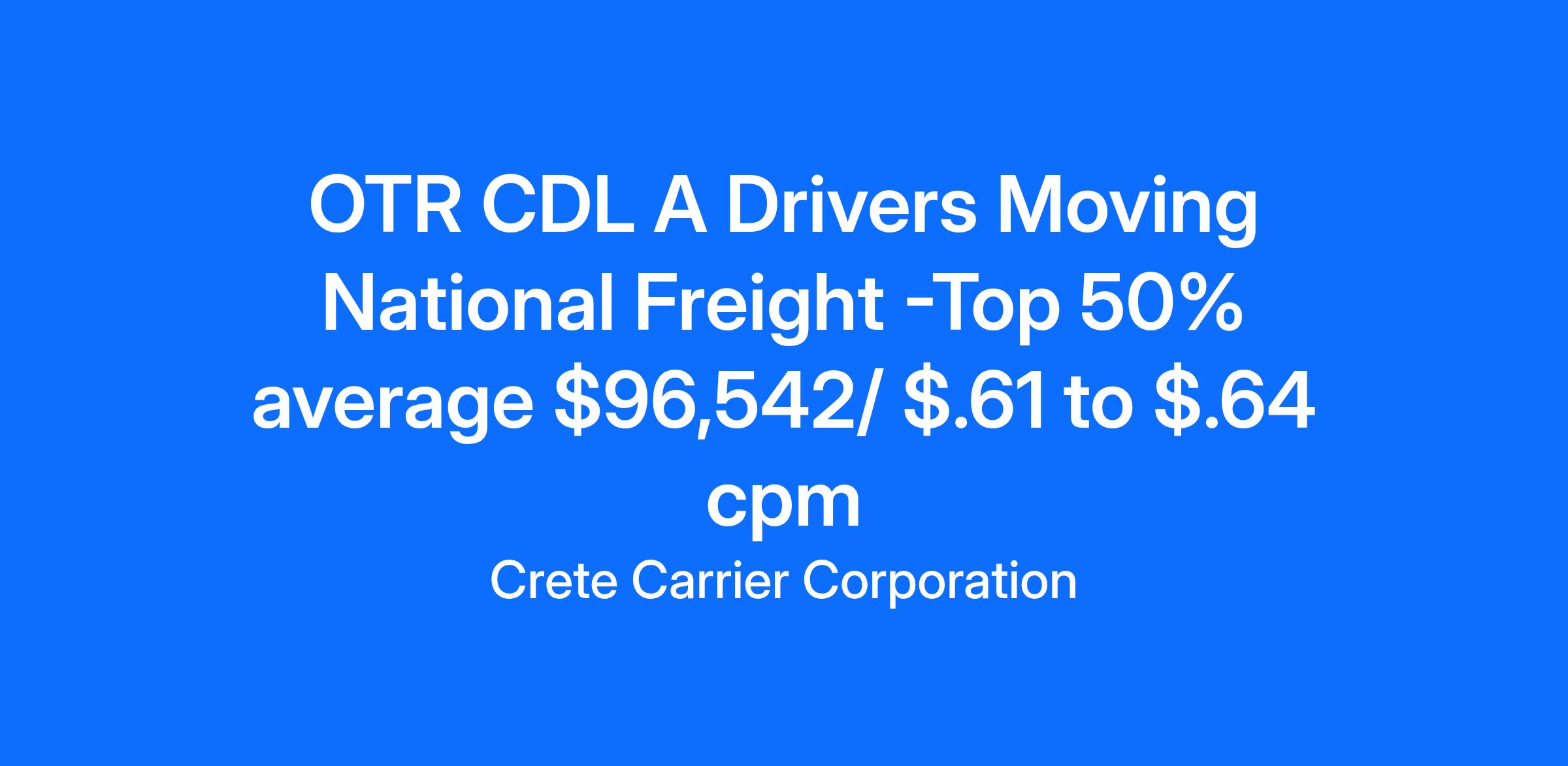 Crete Carrier offers a 21 Days Out. 1 Day Home for Every 6 Days.Salary: Top 50% average $96,542 per yearCPM: Starting pay $.61 to $.64 cpmExperience: One-year verifiable tractor trailer experience with a class A CDL