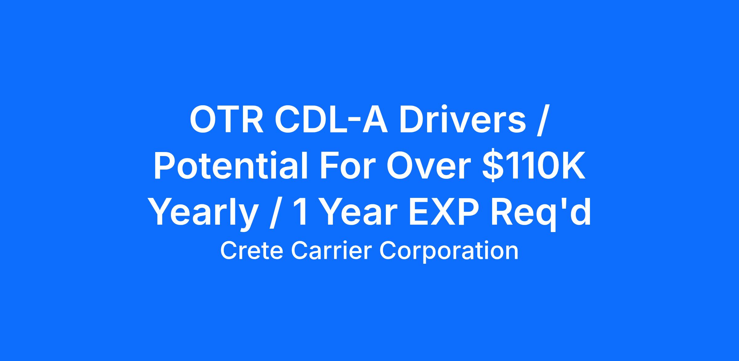 Crete Carrier Is Hiring OTR Solo Truck Drivers Benefits:Top 50% of our dedicated drivers average $1,896 - $2,124 per weekPotential for over $110,000 per year!Four Walmart Distribution Center locations: Cheyenne, WY; North Platte, NE; Pauls Valley, OK; Mankato, MNHome weeklyNo-touch freightPet policyNo-cost rider policyIndustry Leading Benefits Packages - Health, Life, Dental, Vision, and 401(k)Annual profit sharing: Contributed $11 million towards employee profit sharing in 2024Crete has contributed $91.5 million to employee retirement accounts since 2018 Requirements:Minimum 22 years of ageValid Class A CDLMinimum of 1 year OTR experience WHY CHOOSE CRETE CARRIER?At Crete Carrier and Shaffer Trucking, our miles are up significantly. In fact, we need more safe, experienced drivers to meet the needs of our customers. Crete, Shaffer, and Hunt drivers are paid based on practical miles. This means drivers are paid for 3-5 percent more total miles per year than companies that pay based on short route miles. Another added incentive is that those practical miles roll in faster now that we've recently raised our governed truck speed to 68 MPH on the cruise and 65 MPH on the pedal. The most productive 50 percent of our Crete Carrier and Shaffer Trucking OTR drivers average more than $96,542 annually. That equates to over $1,856 weekly; $.61 to $.64 CPM. The top 50% of our Hunt Transportation drivers average $93,347 annually ($1,795 per week), with starting pay ranging from $0.61 to $0.68 per mile. We also offer comprehensive and affordable health insurance, matching 401k and a profit-sharing plan that contributed $11 million in 2024 and more than $91.5 million to employee retirement accounts since 2018. AT CRETE, SHAFFER, AND HUNT, INDUSTRY LEADING PAY IS JUST THE BEGINNING WHAT IS LEADING PAY PLUS?Leading Pay Plus includes the industry leading pay that Crete Carrier Corporation is known for plus the extras which add more to a driver's bottom line, improve a driver's quality of life, and help a driver succeed in their profession. Take a few minutes to see how our Leading Pay Plus program stacks up against your current situation. We believe you'll choose Crete Carrier and Shaffer Trucking. About Crete CarrierOver the past 50 years, Crete Carrier has grown to one of the nation's largest, privately owned trucking companies. Along with sister company, Shaffer Trucking, and wholly-owned subsidiary Hunt Transportation, Crete Carrier Corporation operates as a truckload and flatbed carrier for virtually any commodity. Our drivers are among the best, exceeding the CSA score standards required by the U.S. Department of Transportation. Crete Carrier is a Leading Pay Plus Carrier with industry-leading benefits that include health insurance from BCBS of Nebraska, dental, vision, life, 401K, and a profit-sharing program. Because of this, drivers typically stay with us three times longer than the competition. *Some area restrictions apply.