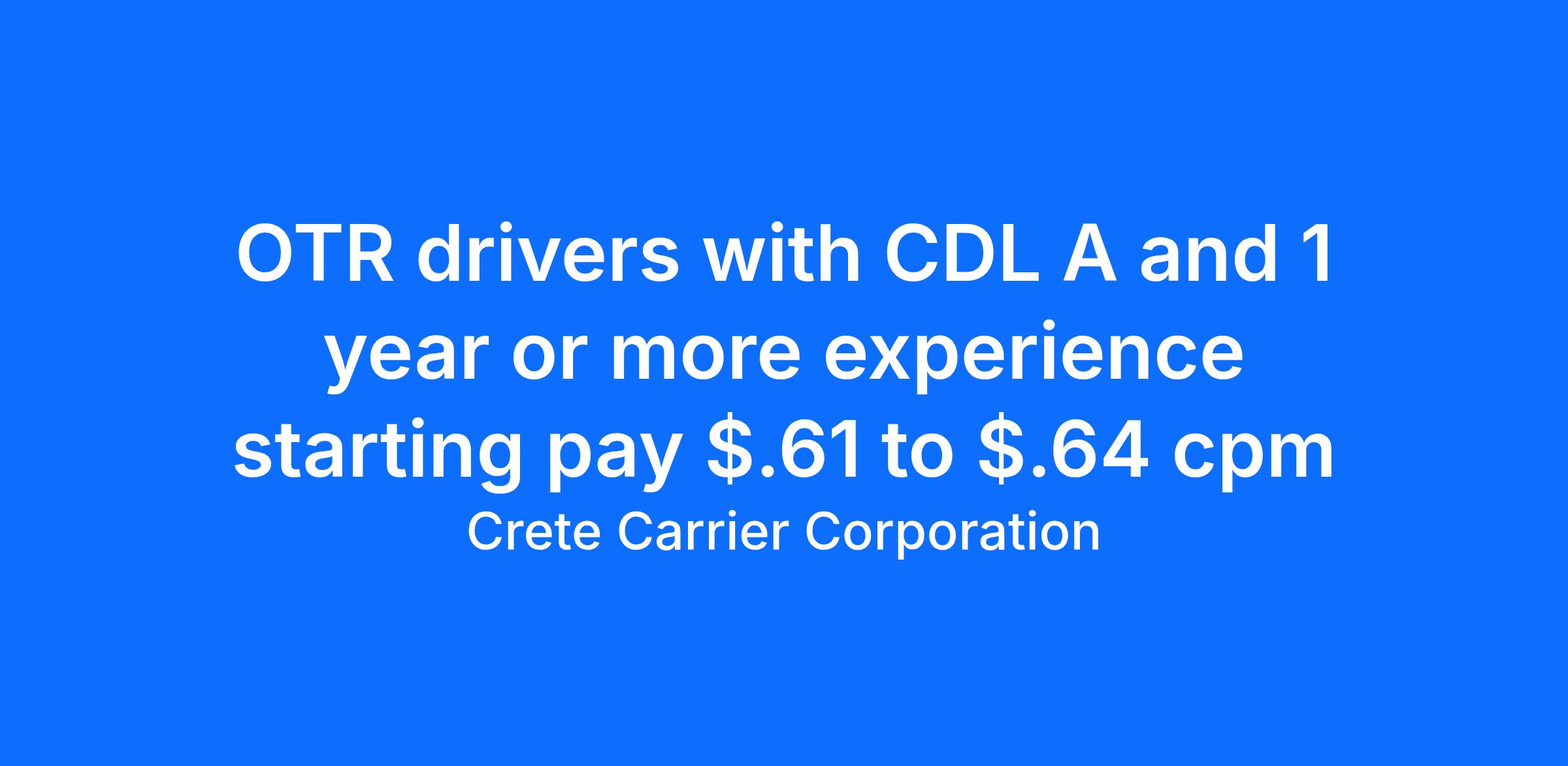 Drivers who want to see the country are a perfect fit for the Crete Carrier and Shaffer Trucking national OTR fleets. These are our highest mileage fleets and home to our top-earning drivers. We're also hiring Idaho drivers for jobs on our Western Regional fleet.Salary: Top 50% average $96,542 per yearCPM: Starting pay $.61 to $.64 cpmExperience: One-year verifiable tractor trailer experience with a class A CDL