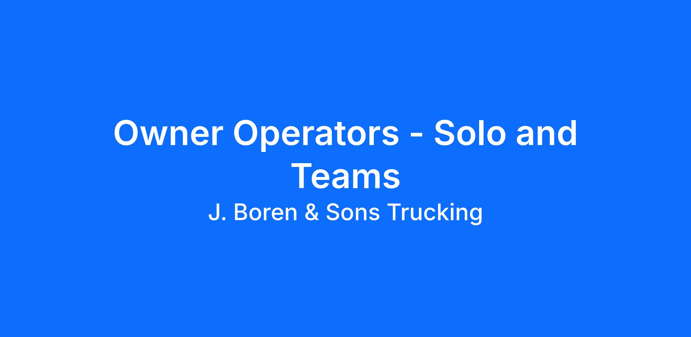 J. Boren & Sons is Seeking Qualified Owner Operators WANT TO TAKE ADVANTAGE OF THE MARKET WHEN IT'S HOT? SWITCH TO OUR PERCENTAGE RATES AT ANY TIME! Owner Operator Trucking Jobs Available Ask Our Recruiters About Our Sign-On Bonus Increase! Pay: Solo Owner Operators: Earn $3,450 per week FSC Average 2,500 miles per week Team Owner Operators: Earn $7,975 per week FSC Average 5,500 miles per week Empty Miles (Solo & Teams): $.80 CPM FSC $300 reimbursement for orientation Offering $1 per mile up to 500 miles to bring truck to class (no trailer needed) Owner Operator Advantages: 100% no touch freight Pets allowed Fuel discount at Love's On site Fuel and Discounts pass through Profit sharing programs for fleet owner w/2 trucks Safety incentives 100% Fuel surcharge 100% Accessorial charges When you drive for us: New trailers 95% drop and hook 24/7 Dispatch (non-forced) Dedicated lanes available for solo and teams (in select areas) Weekly home time Most drivers stay out 10-14 days Job Requirements: Must be at least 23 years of age with a valid CDL A Have 2 years of experience Must own their own truck (2016 or newer Class 8 truck) Must be legally authorized to work in the U.S. No more than 3 non dot preventable accidents No more than 3 minor moving violations in the last 36 months No failed drug or alcohol tests About J. Boren & Sons Trucking We believe that our business is about people not trucks. At J Boren & Son's, we are a small, family-owned company based in Columbus, OH. We have built a culture of respect for our drivers and know each and every one of them by name. Were are growing by leaps and bounces and we are looking for like-minded people to join our Team! (866) ###-####