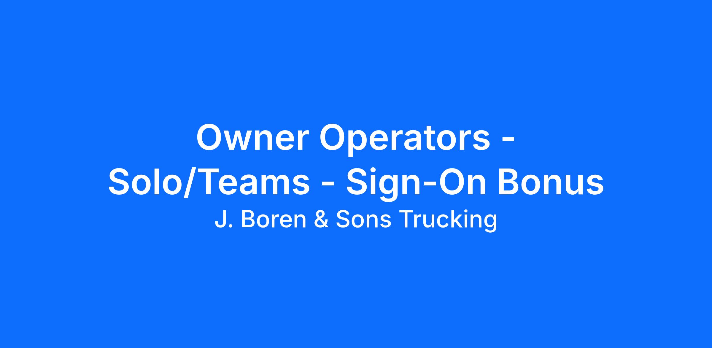 J. Boren & Sons is Seeking Qualified Owner Operators WANT TO TAKE ADVANTAGE OF THE MARKET WHEN IT'S HOT? SWITCH TO OUR PERCENTAGE RATES AT ANY TIME! Owner Operator Trucking Jobs Available Ask Our Recruiters About Our Sign-On Bonus Increase! Pay: Solo Owner Operators: Earn $3,450 per week FSC Average 2,500 miles per week Team Owner Operators: Earn $7,975 per week FSC Average 5,500 miles per week Empty Miles (Solo & Teams): $.80 CPM FSC $300 reimbursement for orientation Offering $1 per mile up to 500 miles to bring truck to class (no trailer needed) Owner Operator Advantages: 100% no touch freight Pets allowed Fuel discount at Love's On site Fuel and Discounts pass through Profit sharing programs for fleet owner w/2 trucks Safety incentives 100% Fuel surcharge 100% Accessorial charges When you drive for us: New trailers 95% drop and hook 24/7 Dispatch (non-forced) Dedicated lanes available for solo and teams (in select areas) Weekly home time Most drivers stay out 10-14 days Job Requirements: Must be at least 23 years of age with a valid CDL A Have 2 years of experience Must own their own truck (2016 or newer Class 8 truck) Must be legally authorized to work in the U.S. No more than 3 non dot preventable accidents No more than 3 minor moving violations in the last 36 months No failed drug or alcohol tests About J. Boren & Sons Trucking We believe that our business is about people not trucks. At J Boren & Son's, we are a small, family-owned company based in Columbus, OH. We have built a culture of respect for our drivers and know each and every one of them by name. Were are growing by leaps and bounces and we are looking for like-minded people to join our Team! (866) ###-####