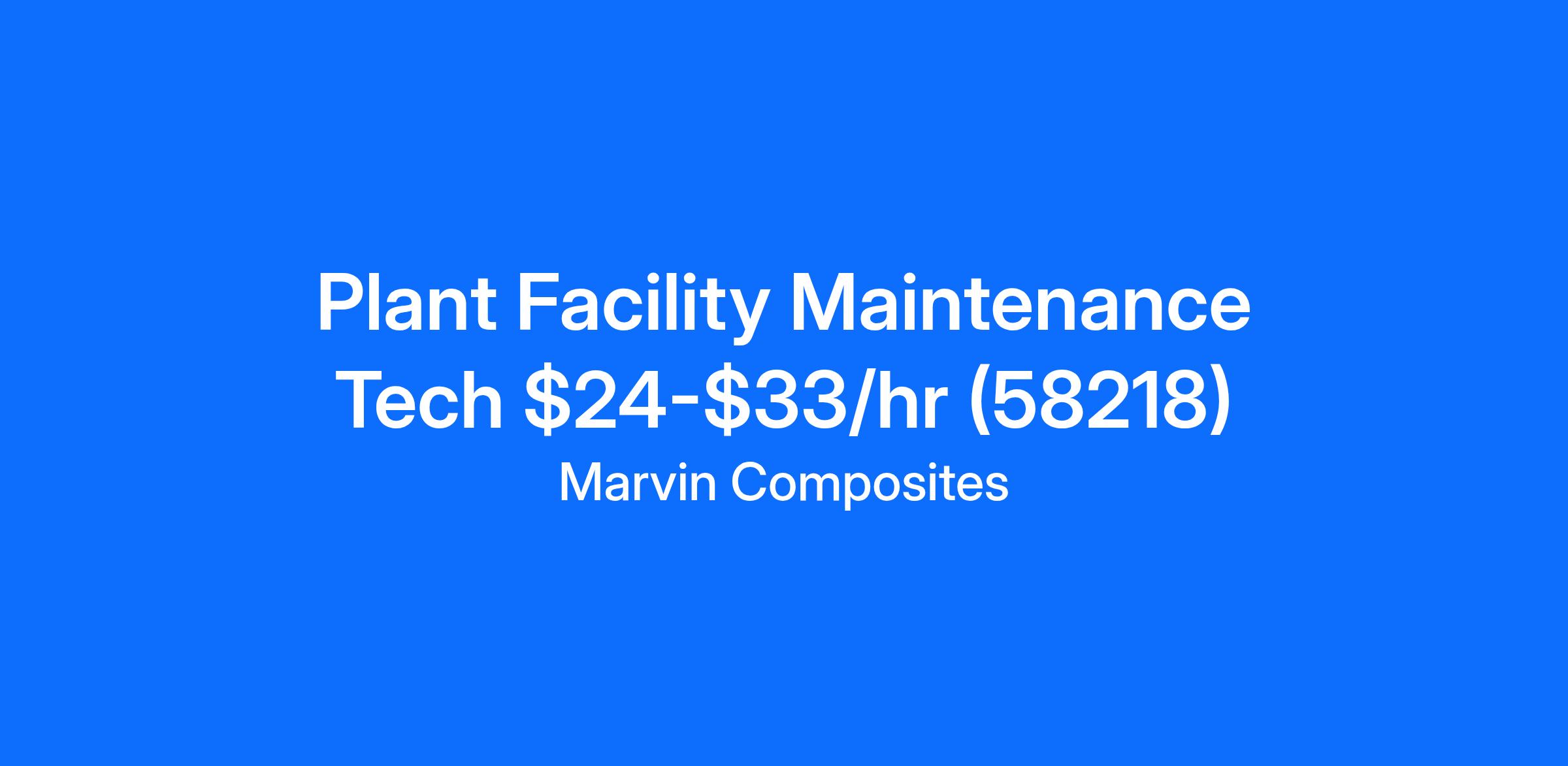 Marvin Composites is hiring a Facility Maintenance Technician for our extrusion plant in Fargo, ND. In this role, you'll work to keep our newer equipment and facility systems running at their best. Your focus will be on preventive and predictive maintenance, along with troubleshooting and repairs when needed. You'll plan your work, coordinate with production teams, and take ownership of keeping operations efficient and reliable. We'll support your growth with training and development opportunities so you can continue building your skills and advancing your career.