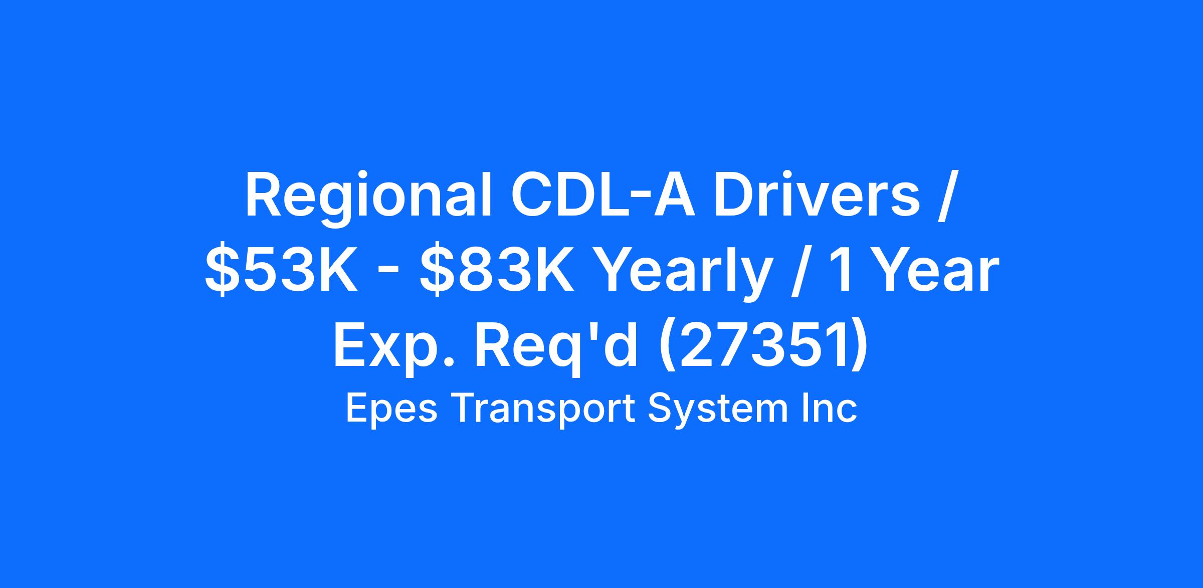 Regional CDL-A Company Driver JobsNew Pay Increase & Weekly Home Time WHAT WE OFFER OUR DRIVERS:Drivers can earn $53,000 - $83,000 a year (based on experience)Benefits Start After 30 DaysHealth, Dental, And Vision Insurance (Free Onsite Clinic)Matching 401K, Life Insurance, And Optional Disability PlanHoliday And Vacation PayAwards Programs: Service, Appreciation, Roadside Inspection, Safe-DrivingTop Achiever ProgramRider ProgramPet PolicyPaid 1.5 day OrientationSpousal Support ProgramScholarship FundCredit UnionDirect Deposit Requirements:At least 21 years old1 year verifiable experience within the last 3 years or 2 within the last 5Stable work history About Us:Epes Transport started business in 1931 in Blackstone, Virginia. Originally known as 'The Transport Company' it began as a family owned business and continued that way for over 55 years. Epes Transport was purchased in September, 1987 by Epes Carriers, Inc. a newly established holding company owned by A.M. Bodford. In July 2013, Greensboro, NC based Epes Transport merged with their sister company Texas Star Express located in Rockwall, TX. In July 2018 Epes was acquired by Penske Logistics. Epes Transport has a 48 state authority and our major transportation markets include the Eastern one-half (1/2) of the United States. Epes has a fleet of over 1400 power units.Epes Transport System is an Equal Opportunity Employer. All qualified applicants will receive consideration for employment without regard to sex, gender identity, sexual orientation, race, color, religion, national origin, disability, protected Veteran status, age, or any other characteristic protected by applicable law.
