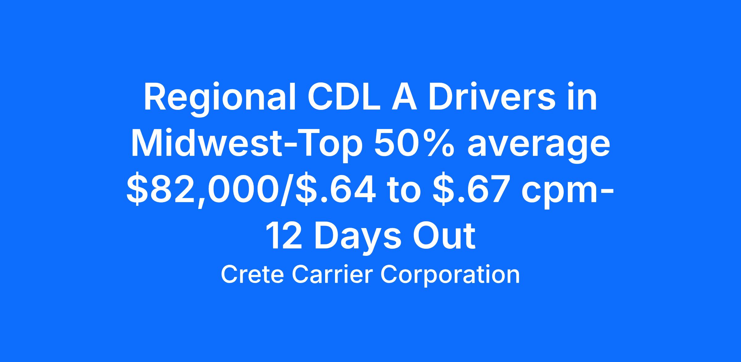 Crete Carrier offers a 12 Days Out. Midwest Regional.Salary: Top 50% average $82,000 per yearCPM: Starting pay $.64 to $.67 cpmExperience: One-year verifiable tractor trailer experience with a class A CDL WHY CHOOSE CRETE CARRIER?At Crete Carrier and Shaffer Trucking, our miles are up significantly. In fact, we need more safe, experienced drivers to meet the needs of our customers. Crete, Shaffer, and Hunt drivers are paid based on practical miles. This means drivers are paid for 3-5 percent more total miles per year than companies that pay based on short route miles. Another added incentive is that those practical miles roll in faster now that we've recently raised our governed truck speed to 68 MPH on the cruise and 65 MPH on the pedal. The most productive 50 percent of our Crete Carrier and Shaffer Trucking OTR drivers average more than $96,542 annually. That equates to over $1,856 weekly; $.61 to $.64 CPM. The top 50% of our Hunt Transportation drivers average $93,347 annually ($1,795 per week), with starting pay ranging from $0.61 to $0.68 per mile. We also offer comprehensive and affordable health insurance, matching 401k and a profit-sharing plan that contributed $11 million in 2024 and more than $91.5 million to employee retirement accounts since 2018. AT CRETE, SHAFFER, AND HUNT, INDUSTRY LEADING PAY IS JUST THE BEGINNING WHAT IS LEADING PAY PLUS?Leading Pay Plus includes the industry leading pay that Crete Carrier Corporation is known for plus the extras which add more to a driver's bottom line, improve a driver's quality of life, and help a driver succeed in their profession. Take a few minutes to see how our Leading Pay Plus program stacks up against your current situation. We believe you'll choose Crete Carrier and Shaffer Trucking. About Crete CarrierOver the past 50 years, Crete Carrier has grown to one of the nation's largest, privately owned trucking companies. Along with sister company, Shaffer Trucking, and wholly-owned subsidiary Hunt Transportation, Crete Carrier Corporation operates as a truckload and flatbed carrier for virtually any commodity. Our drivers are among the best, exceeding the CSA score standards required by the U.S. Department of Transportation. Crete Carrier is a Leading Pay Plus Carrier with industry-leading benefits that include health insurance from BCBS of Nebraska, dental, vision, life, 401K, and a profit-sharing program. Because of this, drivers typically stay with us three times longer than the competition. *Some area restrictions apply.