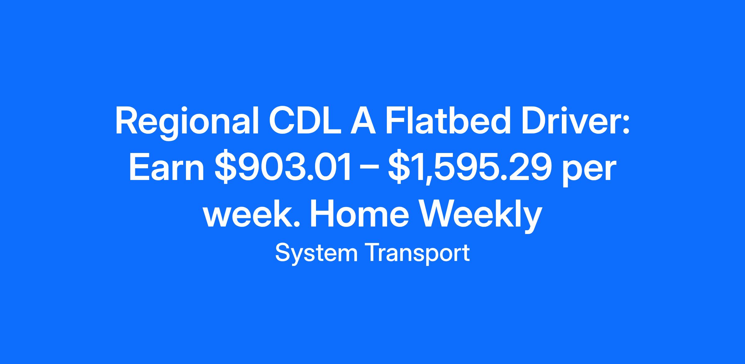 CDL A Flatbed Regional Truck Driver: $903.01 – $1,595.29 per week. Home WeeklyAMERICA PROUD. FLATBED STRONG. DRIVE SYSTEM TRANSPORT!Looking for an exciting driving opportunity in the western region of America? System Transport is hiring experienced CDL-A flatbed truck drivers for regional and OTR routes. As a driver, you will be transporting important goods and materials such as glass, steel, aluminum, building materials, machinery, coils, and specialty metals. We offer competitive pay packages and excellent benefits. Join our team and become America Proud, Flatbed Strong with System Transport. Don't wait, apply now!
