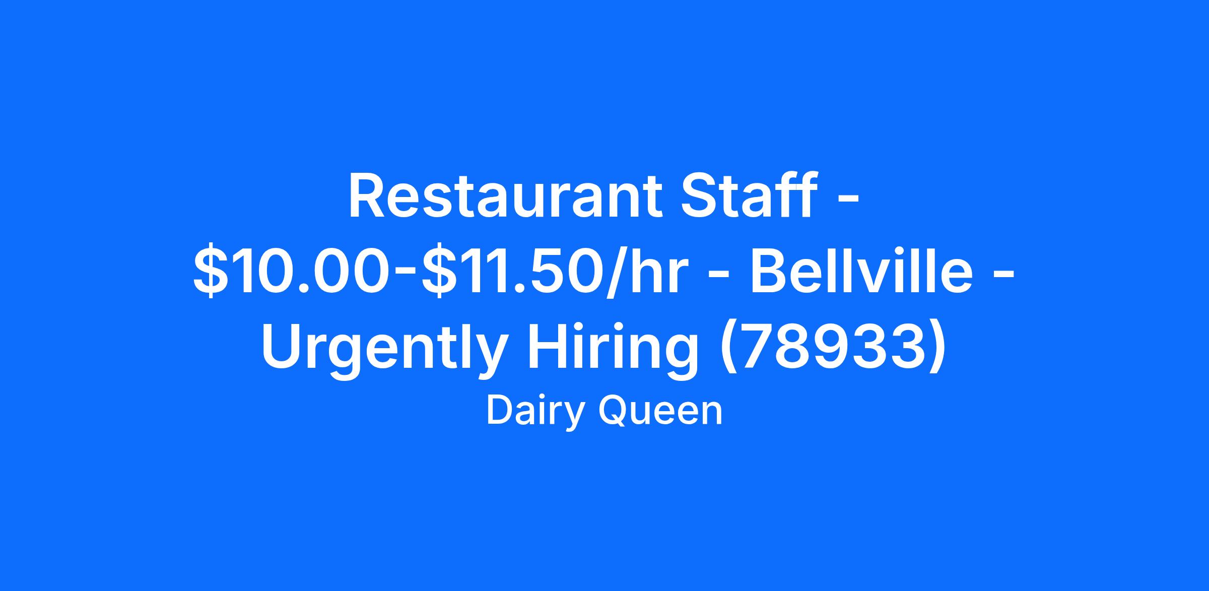 Dairy Queen - Bellville is looking for a full time or part time Restaurant Staff team member to join our team in Bellville, TX. The Restaurant Staff team member is responsible for customer service and commitment to excellence through meeting or exceeding hospitality and service standards.